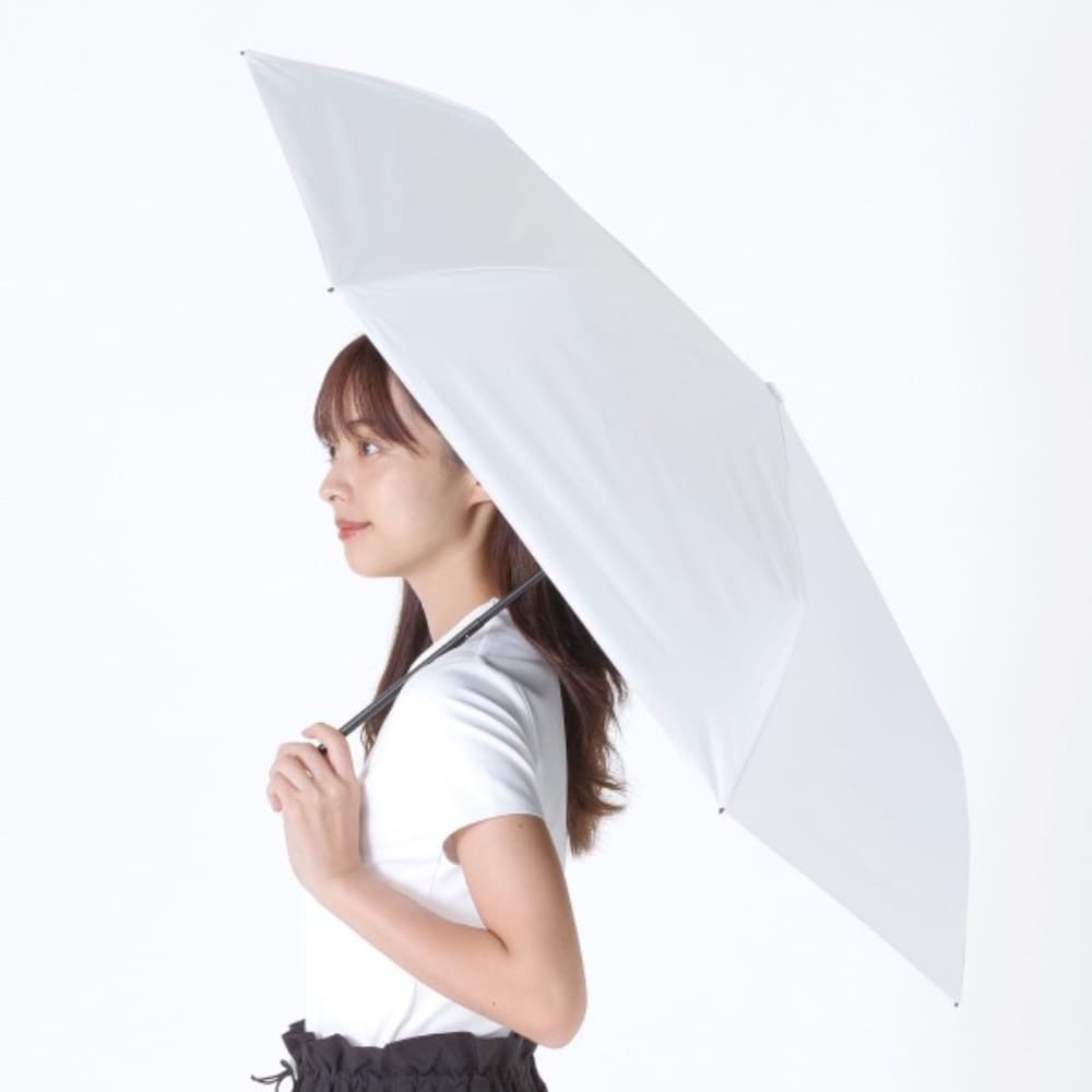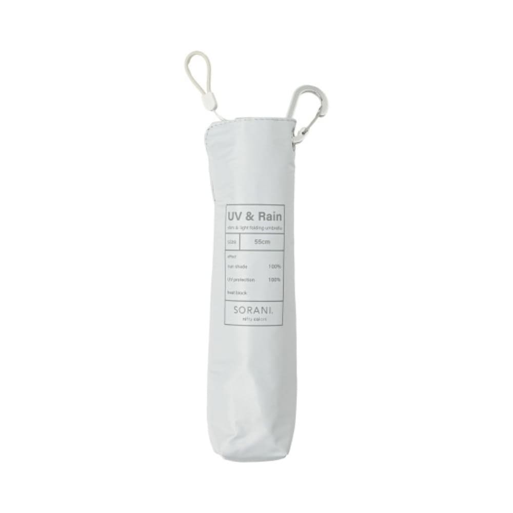 親骨55cmのスリムなシルエットと無駄なデザインを省いたシンプルデザインが「使いやすい」と人気の遮光晴雨兼用折りたたみ傘です紫外線遮蔽率100%、UPF50+、遮光率100%、遮熱性効果で強い日差しや暑さをしっかり遮ります。 雨の日にも安心なはっ水・防水効果もあり、耐水圧の検査も18,000mm以上を計測していますので、晴雨兼用日傘としてオールシーズンお使いいただけます。 標準的な折りたたみ傘(親骨50cm)より開いた時の直径が約8cm大きいので、より広い面をカバーできます。 大きめな日傘をお求めのお客様にぴったりなサイズ感です。 シンプルなデザインなので女性はもちろん男性の方にもおすすめです。 バッグやベルトに引っ掛けられるシルバーのカラビナが付いていて便利です。 指や爪をはさみにくい「安全ろくろ(ストッパー)」を使用しているので、ボタン部分を押して開閉でき安心してお使いいただけます。