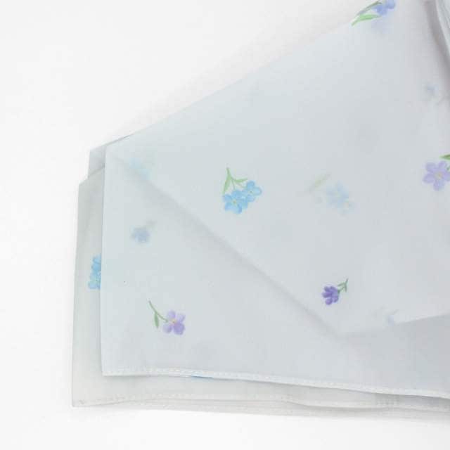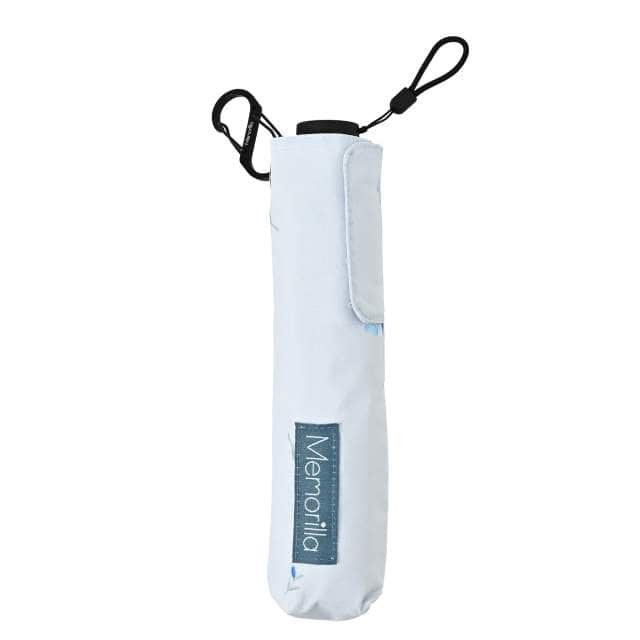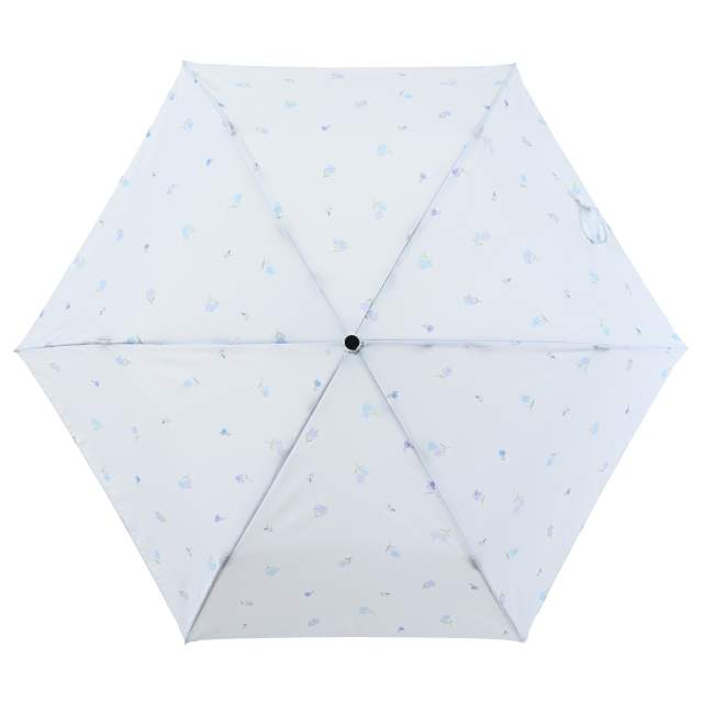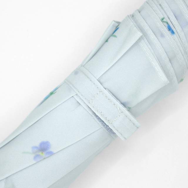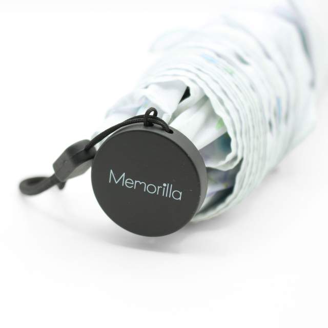 淡いブルー系の小さな花が全面に散らばった、繊細でエレガントなデザインです。パーツ使いを全てブラックで統一し、クールな印象に仕上げました。折りたたみ傘のたたみにくさと従来の形状記憶の重さを解消した「Memorilla(メモリラ)」は、さっとたためる軽量形状記憶傘です。裏面にシートを貼り付ける形状記憶傘と違い、特別な製法で生地に直接折り目を付け、軽さと形状記憶を両立させています。親骨には細くて軽くて丈夫なカーボンファイバーを使用しているので軽さだけでなく巻いた時のスリムさまで実現しました。ケースは開口部が大きく開いて出し入れしやすいマジックテープ付き。両開きタイプのカラビナなので、安定してバッグなどに取り付けることができます。指や爪をはさみにくい「安全ろくろ(ストッパー)」を使用しているので、ボタン部分を押して開閉でき安心してお使いいただけます。