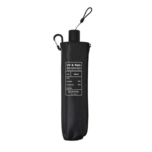 ハンドル部分のボタンを押すだけで自動で開閉してくれる親骨58cmの大きめサイズの自動開閉耐風傘です。 紫外線遮蔽率100%、UPF50+、遮光率100%、遮熱性効果のある一級遮光生地で強い日差しや暑さをしっかり遮ります。 さらに、肌の深部に影響を与える近赤外線も100%遮断します。はっ水・防水機能を備え、耐水圧20,000mm以上を実測。親骨には柔軟性があって丈夫な太めのグラスファイバーを使用し、風を受けてもしなやかに受け流します(風速11m/sの調査済み)。雨の日も安心して使えるオールシーズン対応の晴雨兼用日傘です。親骨58cmサイズは、男性はもちろん大きめのサイズが欲しい女性の方にもおすすめです。傘骨は特殊な構造により手を離した位置でシャフトの伸縮が止まり、少しづつ段階的に収納できるので安全にお使いいただけます。シンプルな無地デザインで男女問わず使いやすく、バッグやベルトに掛けられるカラビナ付き。ケースの脇にファスナーがついているので収納しやすく、持ち運びに便利です。