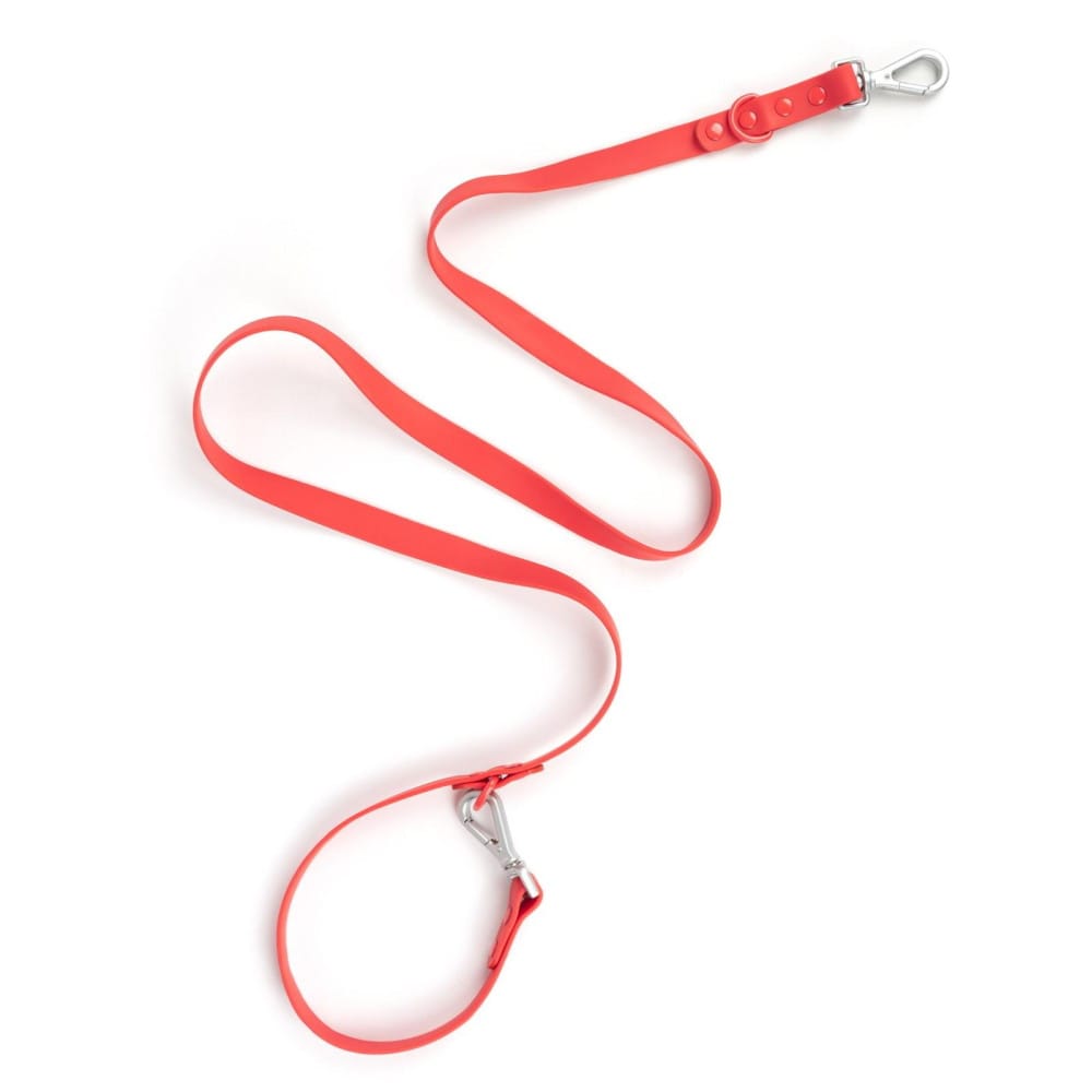 耐久性と柔軟性があるソフトPVC製のリード フック(ナスカン)の留める位置を変えると長さが調整できるため、ハンズフリーリードとしてもご使用いただけます。表面はパウダー加工ですべすべの手ざわり。ツヤ消しのシルバーバックルと同色のDリング、シルク加工のブランドロゴなど、細部までこだわっています。防水素材なので水濡れや泥汚れなどを気にせずお散歩を楽しめます。汚れてもサッと水洗いして拭き取るだけでOK。