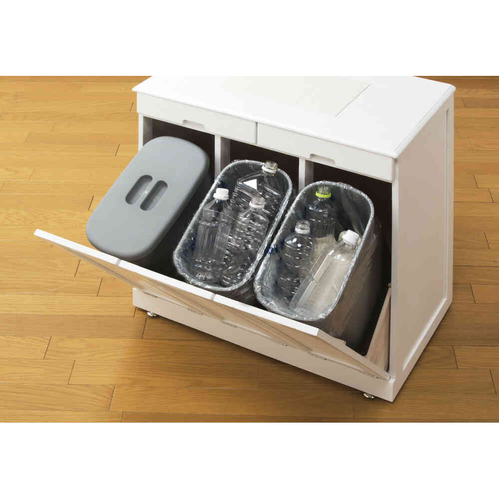 移動もラクラク、便利なダストボックス。 ●落ち着いたデザインなので、お部屋で重宝します。 ●天板は大きめのタイル付きで熱いものも置けます。 ●ペールは全てフタ付きで、嫌な臭いをシャットアウト! ●ペール容量(1個)約15リットル ●分別に便利なネームラベル付き。 ●転倒防止のアジャスター付き。 ●組立不要完成品