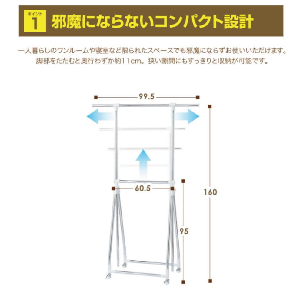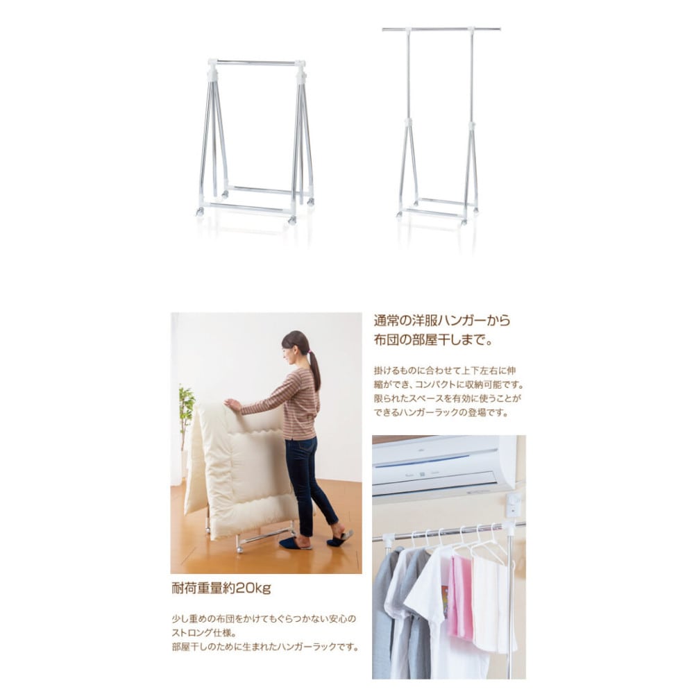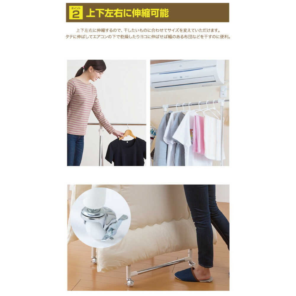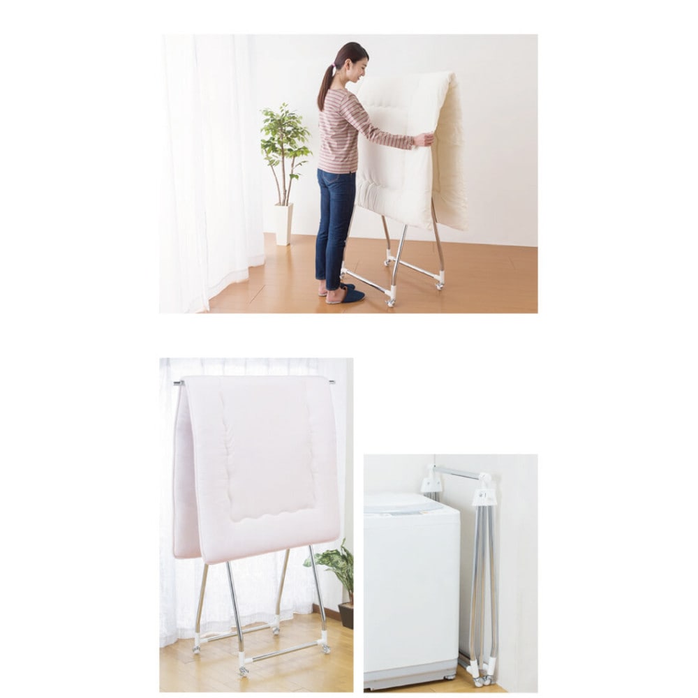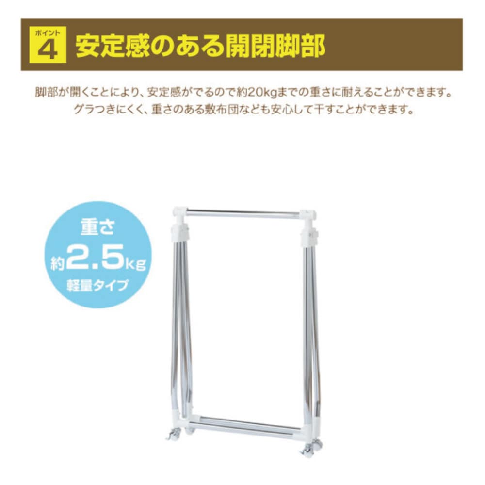 雨や雪で外に干せない時もお部屋でサッと開いて洗濯物や布団を干せます。 ●高さを調節できるワンタッチストッパーで簡単に干せます。 ●花粉対策の部屋干しにもオススメ。 ●掛けるものに合わせて伸縮自在。 ●敷布団も干せます。 ●折りたためば約11cmとコンパクトに収納できます。 ●ストッパー付きのボールキャスターで小回り自在。 ●キャスター付き ●お客様組立式