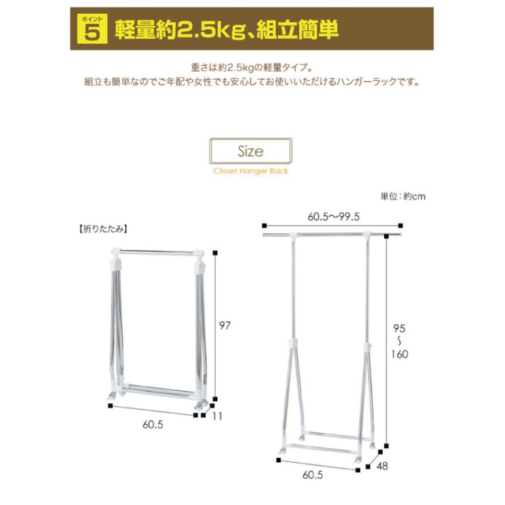 サイズ:使用時:(約)幅60.5~99.5×奥行48×高さ95~160cm、収納時:(約)幅60.5×奥行11×高さ97cm 重さ:(約)2.5kg 耐荷重:(約)10kg