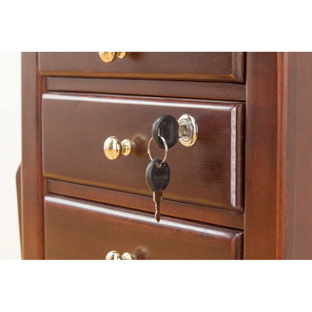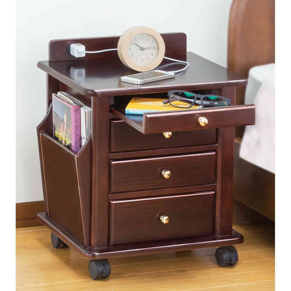 リビングやベッドサイドに手近にあると何かと便利! ●背かざりにはコンセント付きで携帯の充電などに便利。リビング周りでも大活躍。 ●インテリア性の高いお洒落な背かざり。 ●引き出しの一杯は鍵付きなので、大切な物も安心して収納できます。 ●スライドテーブル付き。 ●左右付け替え自由のマガジンラック。 ●深さの異なる3段の引き出しは、小物からかさばる物まで収納OK! ●付属品/キャスター付、コンセント付き ●一部組立式 ※キャスター、飾り棚、マガジンラックは取り付け