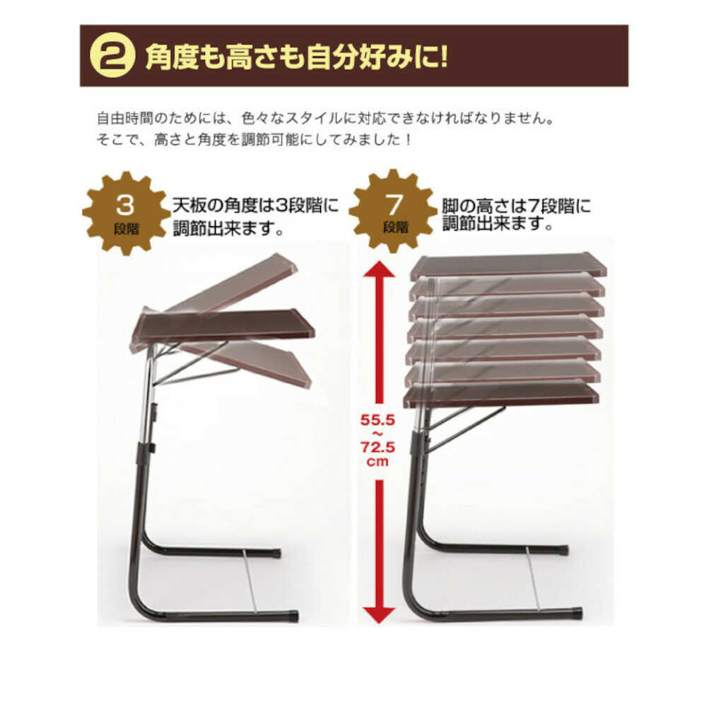 どなたでも簡単に引き寄せて使えるテーブル。 ●使いたい時だけ広げられてお部屋は広々!お食事の時に、パソコンに、書き物に。 ●わざわざテーブルの前に座る必要はありません!テレビの前や、ベッド、好きな所にこのテーブルを持ってくればOK! ●天板の角度は3段階に調節できます! ●脚の高さは7段階に調節できます!(天板の床面からの高さ約72.5~55.5cmで調節可) ●補強バーが付いて安定性が増しました。 ●折りたたんでコンパクトに収納できます。 ●お客様組立式