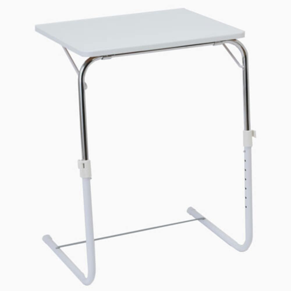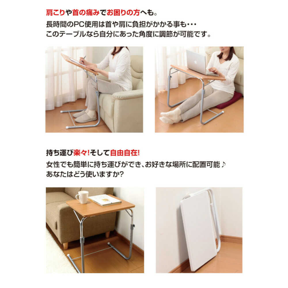 どなたでも簡単に引き寄せて使えるテーブル。 ●使いたい時だけ広げられてお部屋は広々!お食事の時に、パソコンに、書き物に。 ●わざわざテーブルの前に座る必要はありません!テレビの前や、ベッド、好きな所にこのテーブルを持ってくればOK! ●天板の角度は3段階に調節できます! ●脚の高さは7段階に調節できます!(天板の床面からの高さ約72.5~55.5cmで調節可) ●補強バーが付いて安定性が増しました。 ●折りたたんでコンパクトに収納できます。 ●お客様組立式
