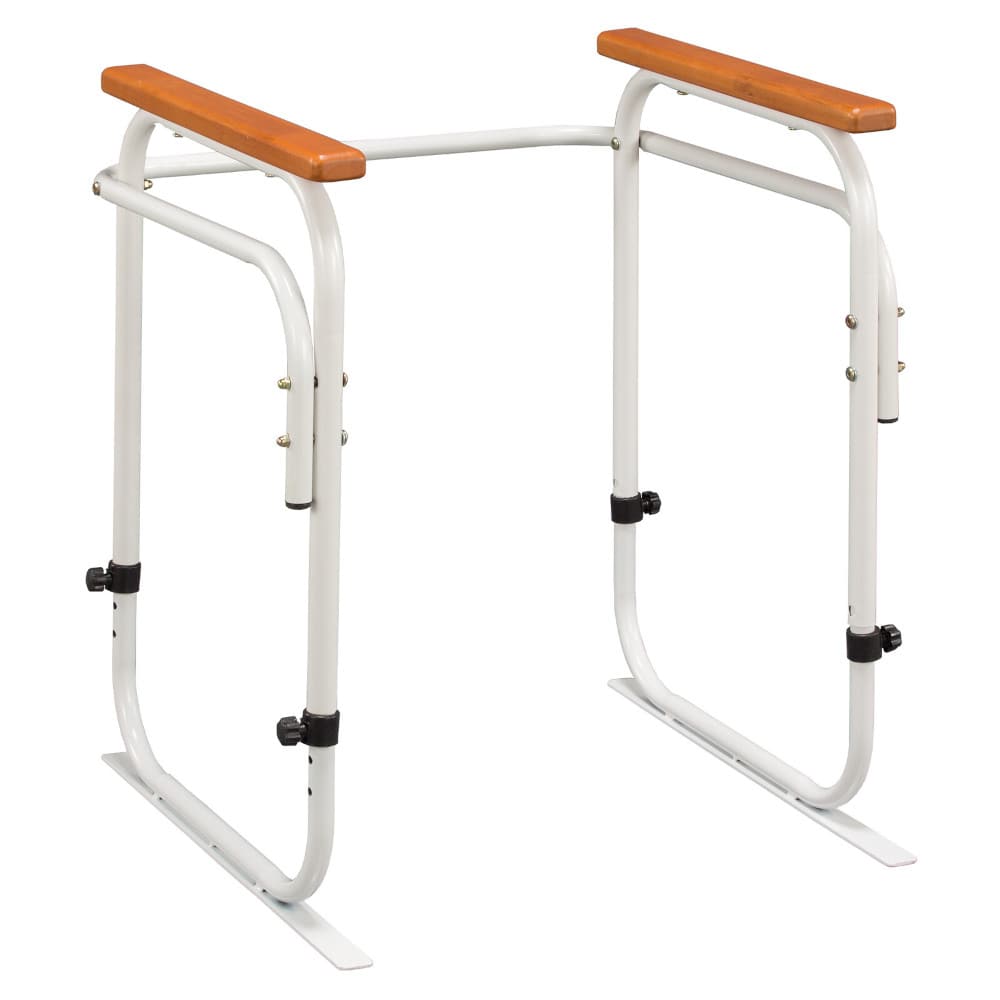 お年寄りも安心・快適!組立式のトイレ用アーム。 ●体の近くに手すりがあるのでしっかり握れ、両腕でバランスよく体重を支えることができ、安心です。 ●あたたかみのある天然木の手すり。 ●高さ5段階調整:トイレの形状・使う方の体格に合わせて、約3cm刻みで肘の高さを調整できます。 ●両面テープで固定:左右両側の平らなバーを付属の両面テープで固定するので安定感があります。 [仕様] ●肘高さ5段階調整:61・64・67・70・73cm ●両面テープ付き ●お客様組立式