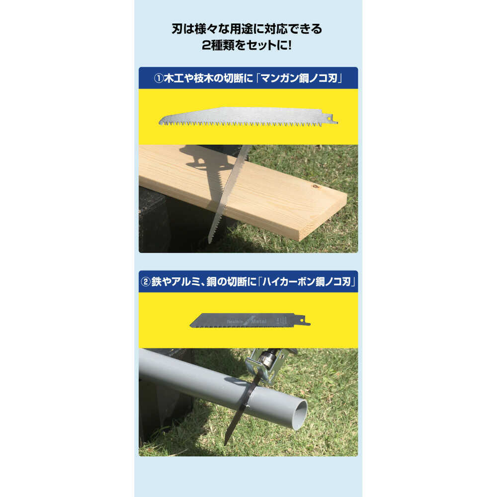電動ノコギリで作業効率アップ ●枝切り、切断、解体など、様々な作業をこれ1台でスピーディーにこなせるハイパワー電動ノコギリです。 ●15mmのストローク幅と最大3,000回転/分の高速切断で、木材、金属、プラスチックなど、さまざまな素材をスムーズにカット。 ●軽量コンパクトでコードレスだから、場所を選ばずどこでも手軽に使用できます。(本体重量:バッテリー含まず1.1kg) ●用途に合わせて選べる2種類のノコ刃が付属。丈夫なマンガン鋼のノコ刃は木材やじゅうたん、ハイカーボン鋼のノコ刃は金属やプラスチックの切断に最適です。 ●ロック機能付きで誤操作を防ぎ、LEDライト搭載で暗い場所での作業も安心です。 ●約3時間で充電完了、連続使用約20分と、作業効率も抜群。 ●一部組立式 [仕様] ●電源:AC100V ●充電時間:約3時間 ●連続使用時間:約20分 ●バッテリー容量:約1,500mAh [セット内容] 本体、マンガン鋼ノコ刃替え刃2枚、ハイカーボン鋼ノコ刃替え刃2枚、ACアダプター、バッテリー2個、収納ケース ●6ヶ月間保証書付き ※製品を使用する前には取扱説明書を必ずお読みください。