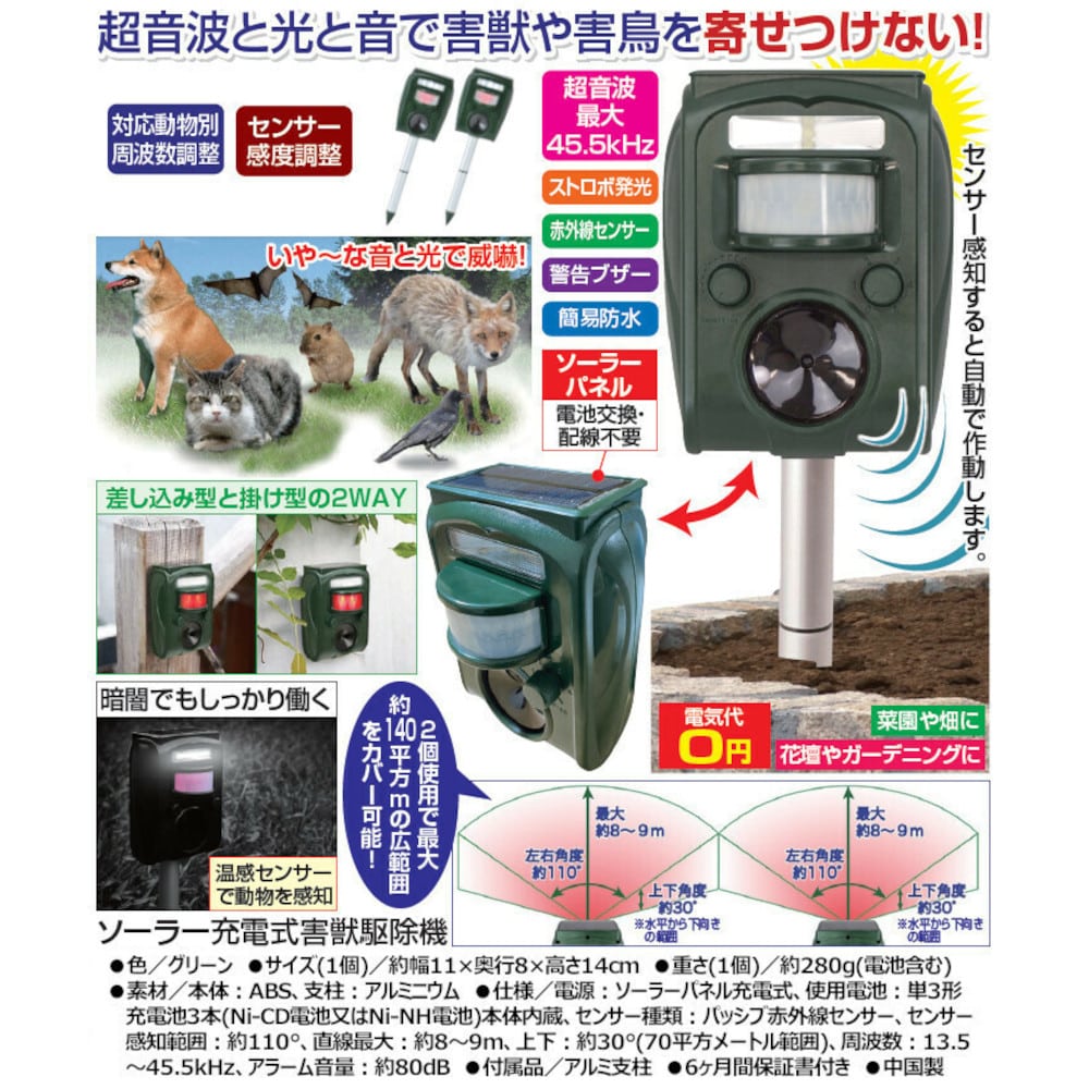 超音波と光と音で害獣や害鳥を寄せつけない! ●色/グリーン ●対応動物別周波数調整・センサー感度調整 ●超音波最大45.5kHz・ストロボ発光・赤外線センサー・警告ブザー・簡易防水 ●いや~な音と光で威嚇! ●センサー感知すると自動で作動します。 ●ソーラーパネル:電池交換・配線不要 ●電気代0円 ●菜園や畑に、花壇やガーデニングに ●差し込み型と掛け型の2WAY ●暗闇でもしっかり働く。温感センサーで動物を感知 ●2個使用で最大約140平方mの広範囲をカバー可能! [仕様] ●電源:ソーラーパネル充電式 ●使用電池:単3形充電池3本(Ni-CD電池又はNi-NH電池)本体内蔵 ●センサー種類:パッシブ赤外線センサー ●センサー感知範囲:約110度、直線最大:約8~9m、上下:約30度(70平方メートル範囲) ●周波数:13.5~45.5kHz ●アラーム音量:約80dB [付属品] アルミ支柱 ●6ヶ月間保証書付き