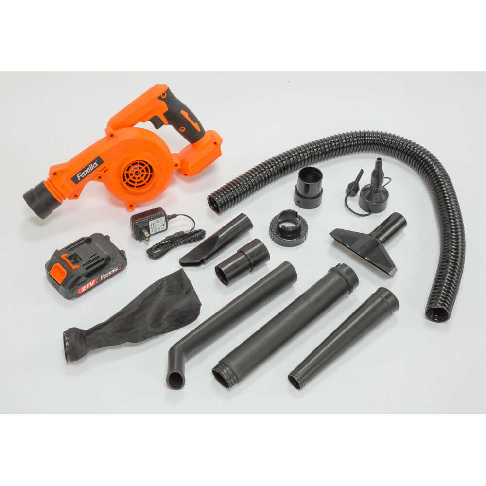 充電式コードレスなので屋外での落ち葉清掃、洗車後の水飛ばし作業に便利。 ●ノズルを側面に挿しかえれば掃除機にもなり一台で二役。 ●ガーデンノズル付きで腰を屈めずに落ち葉などの吹き飛ばし作業ができ負担を軽減。 ●エアポンプノズルも付いてエアーベッドや浮き輪などの空気入れ、空気抜き作業も楽にできます。 ●組立不要完成品 [仕様] ●電源:AC100V ●充電時間:約3時間 ●連続使用時間(目安):約10分間(風量最大時、環境により異なる) ●バッテリー容量:約1,500mAh ●風量:2.8m3/min ●回転数:17,000rpm/min ●風速:0-30m/s [セット内容] 本体、ショートノズル、ガーデンノズル、ガーデンノズルアタッチメント、隙間ノズル、ワイドノズル、フレキシブルホース、フレキシブルホースアタッチメント2種、エアポンプノズル、ダストパック、吸塵用アタッチメント、ACアダプター、21Vバッテリー2個 ●6ヶ月間保証書付き