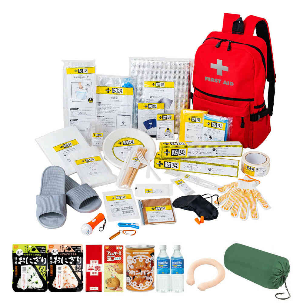 「まずは生きる」ための一時避難に絞った防災用品30点に食品・寝袋までついた特選39点セット!! ●防災グッズは全てリュックの中に入るので収納にも持ち運びにもとっても便利です!これだけ入って重さ約2kgの軽量バッグ!! ●突然の非常時にサッと持ち出せる。 ●リュックには反射材付きで夜でも安心! ●軽量約2kg(バッグ内30点) ●30点セット+今回特別!厳選アイテム9点追加! [セット内容] リュックサック、アルミブランケット、レインポンチョ、懐中電灯、ホイッスル、軽量サンダル、アルミシート、紙皿×3枚、プラカップ×5個、木製箸×5膳、スプーン・フォークセット、ストロー×3本、ラップ、アルミホイル、フェイスタオル、綿棒×20本、排尿パック×2個、ゴミ袋×3枚、非常用給水バッグ、エア枕、アイマスク、耳栓、ウェットティッシュ、軍手、歯ブラシ、圧縮袋、養生テープ、カッター、予備袋、筆記用具セット、洗えるあったか3WAY寝袋、備蓄カンパン(110g×1缶)、おにぎり(鮭×1、わかめ×1)、ライスクッキー8枚入×1、立山の天然水500ml×2本、備蓄ようかん(50g×1本)、ふわぽかリング