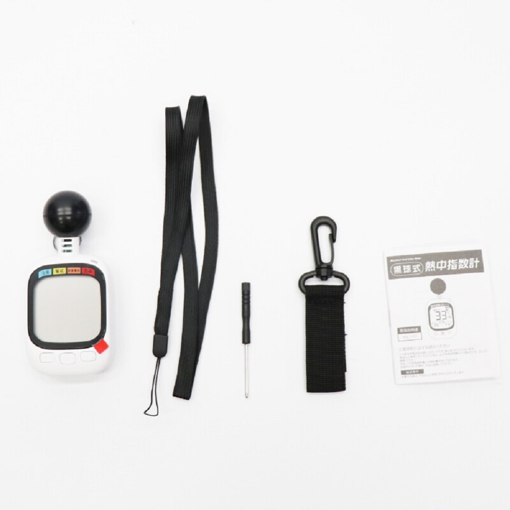 温度計や湿度計では測れない本当の真夏の暑さを見える化!! ●ご存知ですか?2025年6月1日より職場の猛暑対策が義務化されました! ●本体上部の黒球が、日差しや地面からの輻射熱を測定し、「実際に体が感じる暑さ」を数値化。 ●屋外・屋内の熱中リスクを判断! ●こんな時は要注意!気温が高い、湿度が高い、日差し・照り返しが強い、熱がこもる ●黒球が輻射熱を測定。 ●周囲の温度と湿度を測定。 ●WBGT・時計・温度・湿度 ●WBGTとは熱中症の危険度を判断する指数です。 ●アラーム機能付き ●ストラップ付き [仕様] ●電源:単4形アルカリ乾電池2本使用(別売) ●[表示範囲]温度:-9.9度~60.0度、湿度:0.1%~99.9%RH、WBGT:0度~50度 ●[精度]温度:20.0度~40.0度:±0.6度、19.9度以下および40.1度以上:±1.0度、湿度:30%~90%RH:±5%、29.9%以下および90.1%RH以上:±10% ●電池の使用可能時間:約1年 [付属品] カラビナ、ネックストラップ、ドライバー、取扱説明書 ●6ヵ月間保証書付き