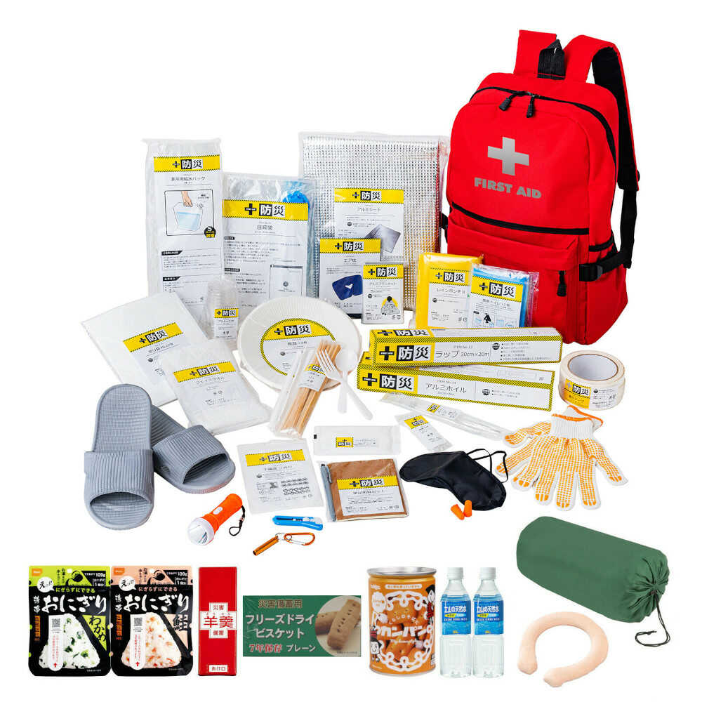 「まずは生きる」ための一時避難に絞った防災用品30点に食品・寝袋までついた特選39点セット!! ●備えあれば憂いなし、備えて安心30点セット+今回特別!厳選アイテム9点追加!!非常食6種7品目(おにぎり2種・羊羹・フリーズドライビスケット・カンパン・保存水2本)・ふわぽかリング・洗えるあったか3WAY寝袋 [セット内容] リュックサック、アルミブランケット、レインポンチョ、懐中電灯、ホイッスル、軽量サンダル、アルミシート、紙皿×3枚、プラカップ×5個、木製箸×5膳、スプーン・フォークセット、ストロー×3本、ラップ、アルミホイル、フェイスタオル、綿棒×20本、排尿パック×2個、ゴミ袋×3枚、非常用給水バッグ、エア枕、アイマスク、耳栓、ウェットティッシュ、軍手、歯ブラシ、圧縮袋、養生テープ、カッター、予備袋、筆記用具セット、洗えるあったか3WAY寝袋:収納袋付き、備蓄カンパン:110g×1缶、携帯おにぎり各42g(鮭・わかめ)×各1袋、保存水:500ml×2本、フリーズドライビスケット(プレーン):50g×1箱、備蓄ようかん:50g×1本、ふわぽかリング:表面温度約50度・カバー手洗い可