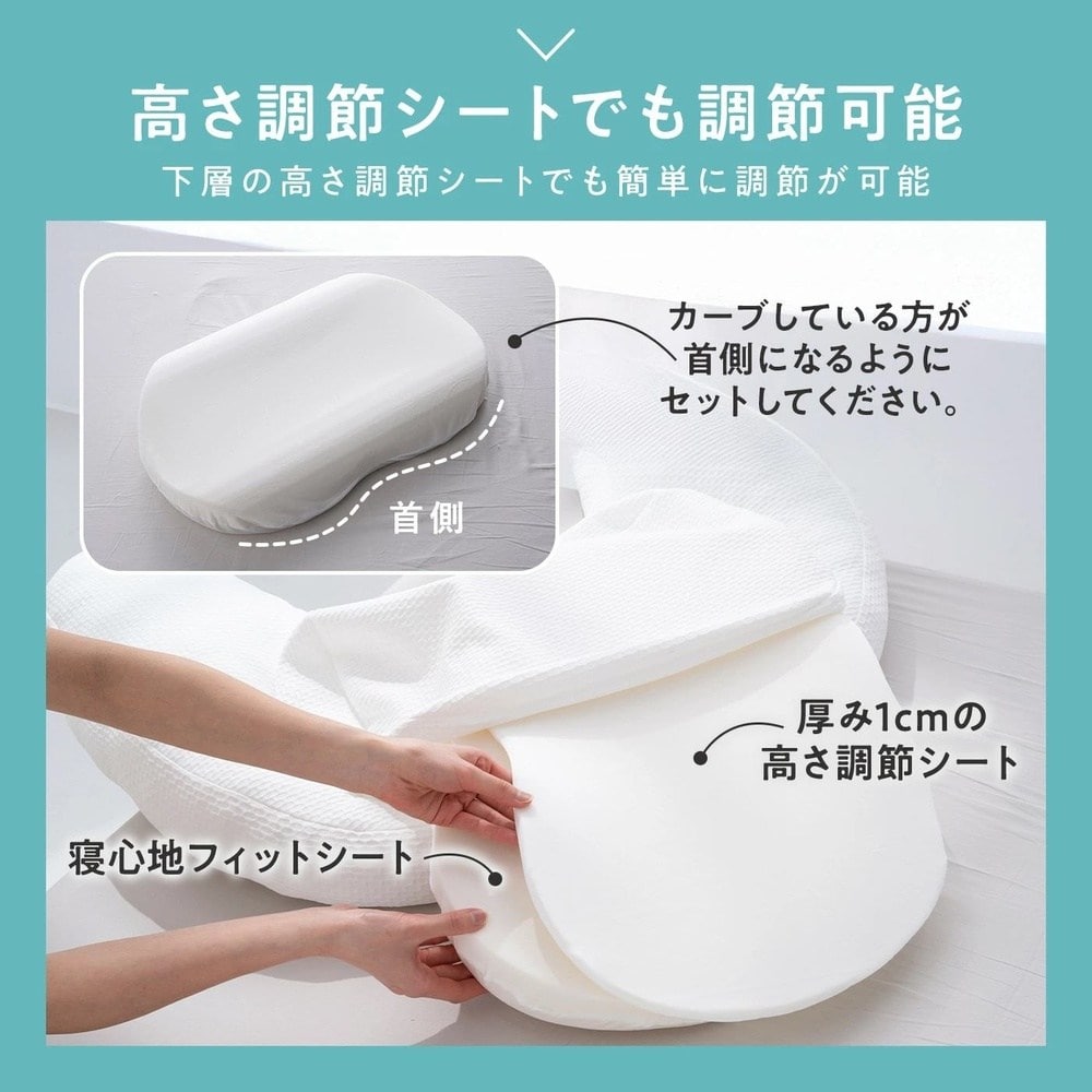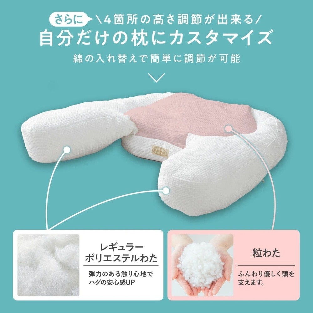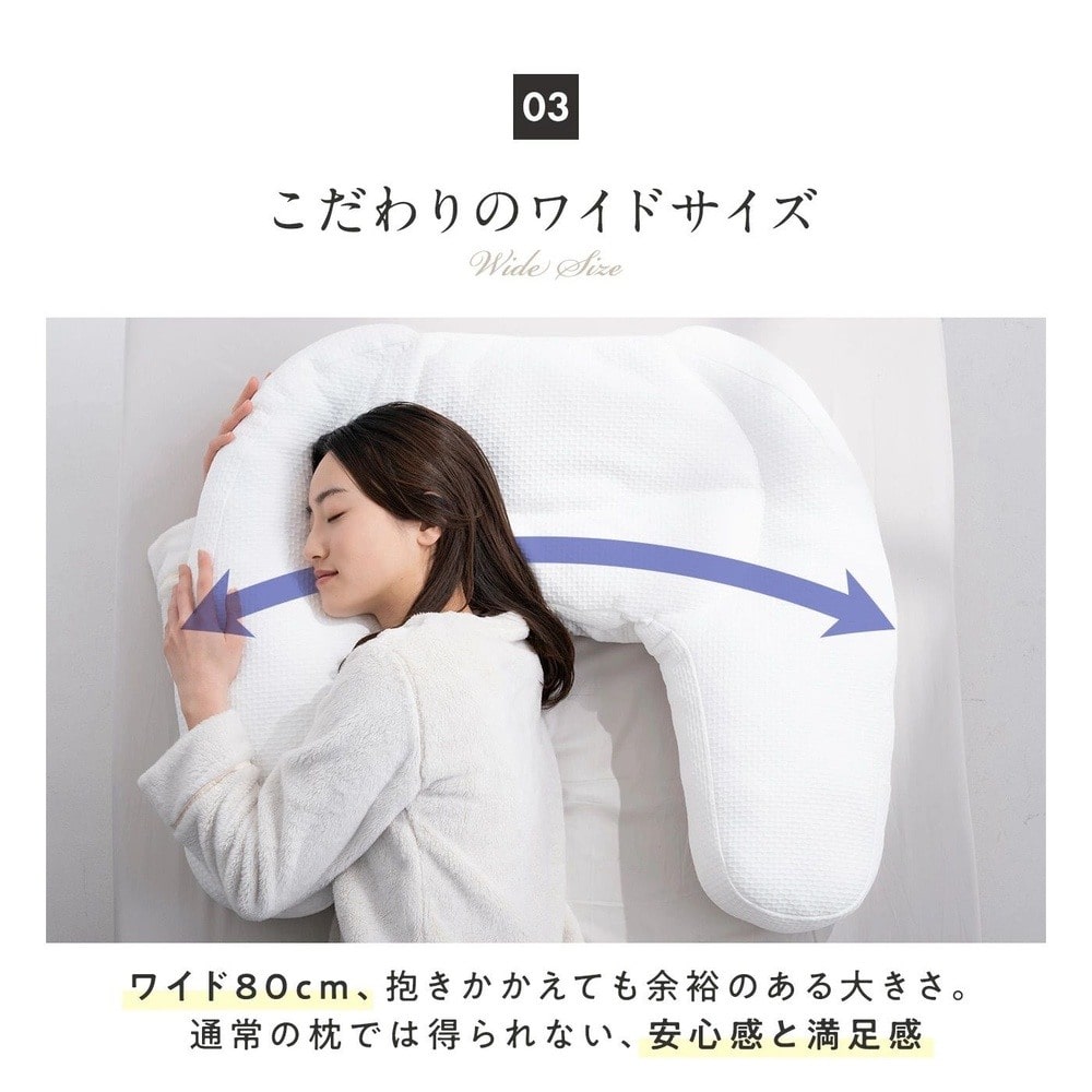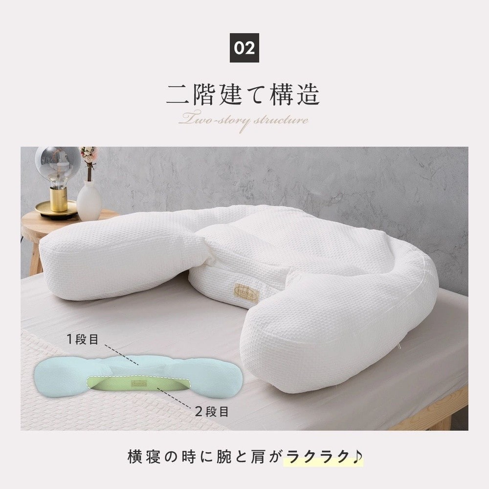 抱きしめる安心感と、離れない安定感を。 ポイント1 4箇所の高さ調節で自分だけの枕にカスタマイズ ポイント2 特許取得構造を採用し横寝でも腕肩ラクラク「二階建て構造」を採用。腕肩ポケットに肩がすっぽりとはまり、首と肩の体圧が分散されかつてないフィット感に。 ポイント3 女性の肩幅に合わせたこだわり設計