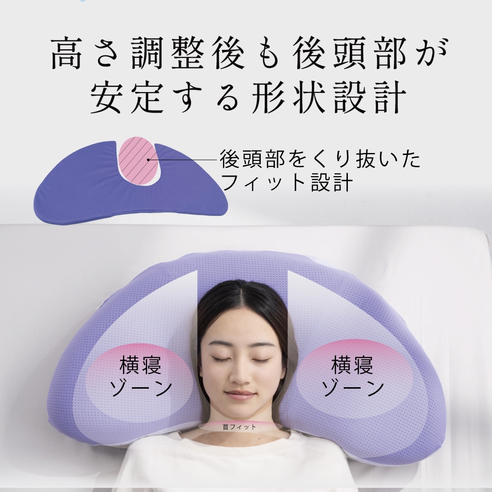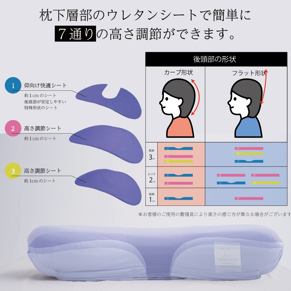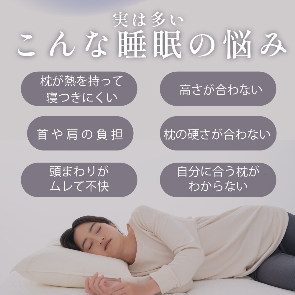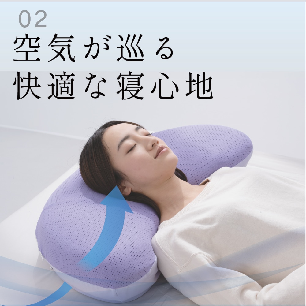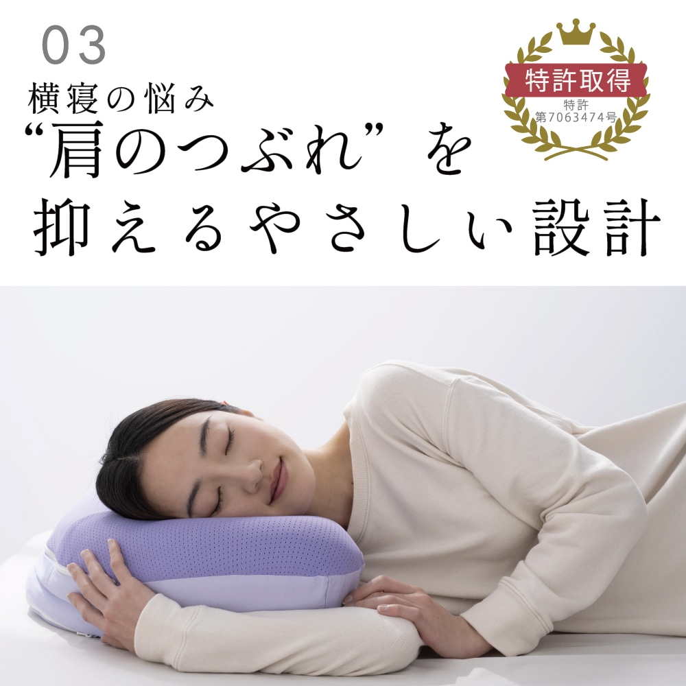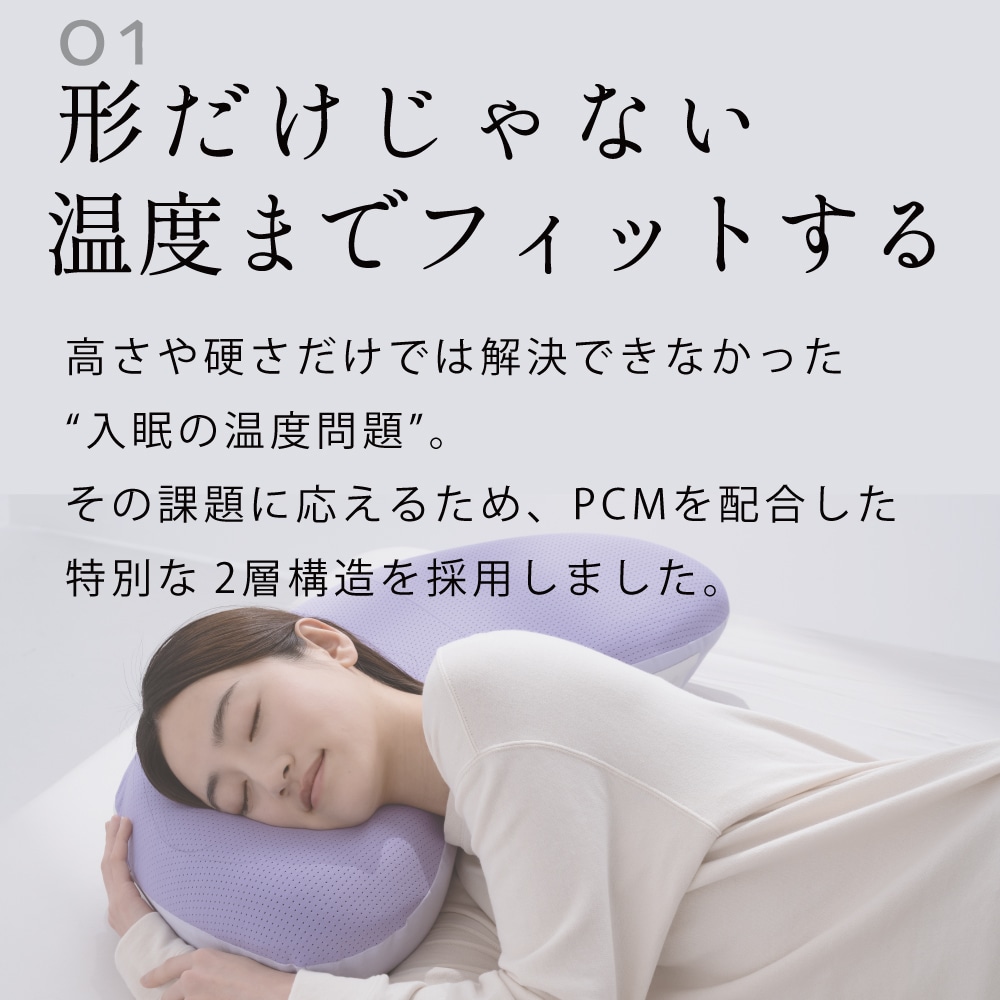 温度を整え快適な寝心地へ 眠りの質を大きく左右するのは「温度」。 体にとって負担のない“ちょうど良い心地よさ”で、 快眠へと導きます。 ■形だけじゃない温度までフィットする 高さや硬さだけでは解決できなかった”入眠の温度問題”。その課題に応えるため、PCMを配合した特別な2層構造を採用しました。 ■空気が巡る快適な寝心地 枕の中を空気がスッと通り抜けこもりやすい熱や湿気を軽減。寝返りした時にさらっとしたやさしい寝心地です。 ■”肩のつぶれ”を抑えるやさしい設計 YOKONEGUこだわりの二階建て構造は横寝時の腕と肩の負担を軽減し。翌朝まで横寝姿勢を快適にサポート