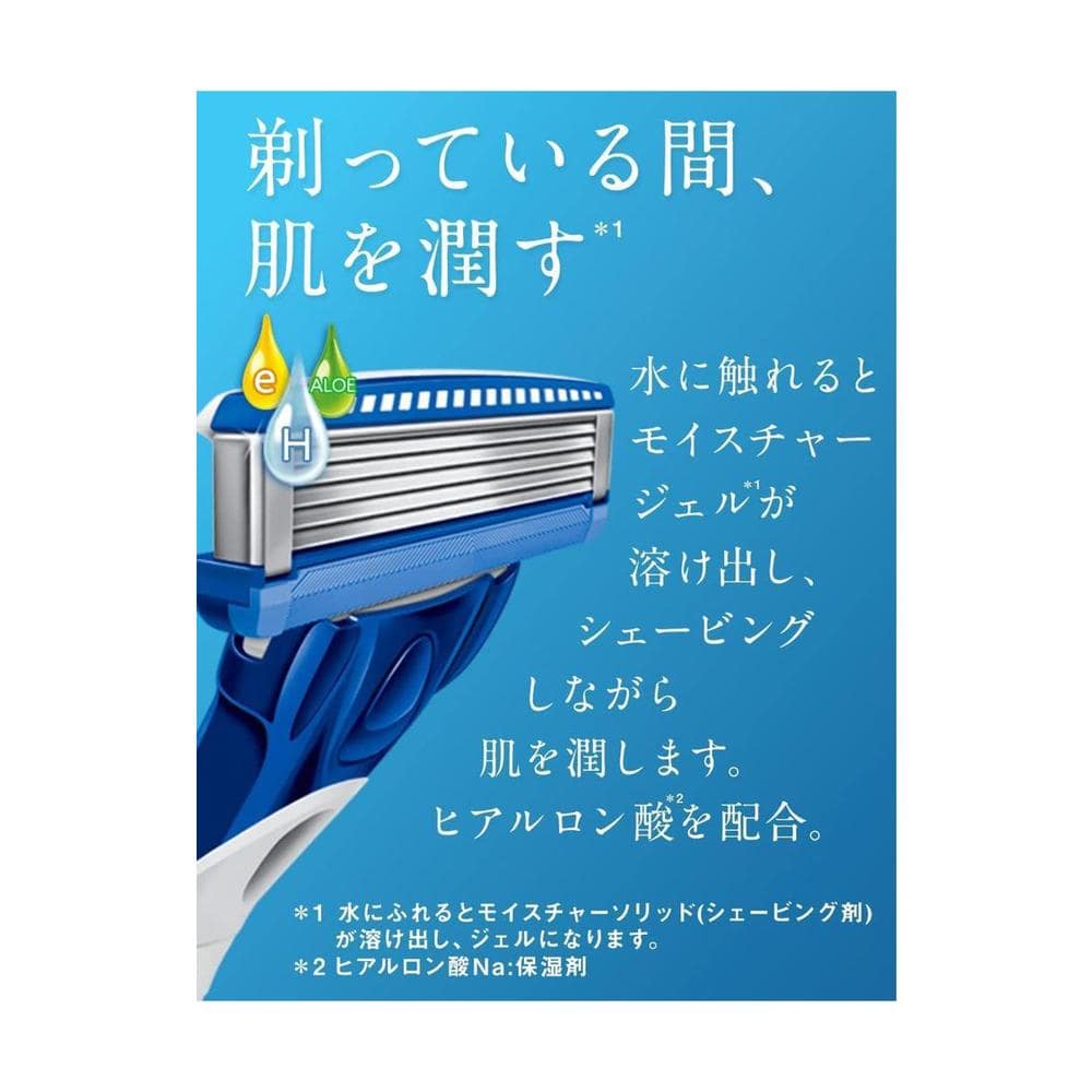 肌を守りながら剃る、スキンケアシェービングのハイドロシリーズ。 肌トラブルが気にならない方に、モイスチャージェルBOXにヒアルロン酸(保湿剤)を配合したハイドロ5ベーシックの替刃。
