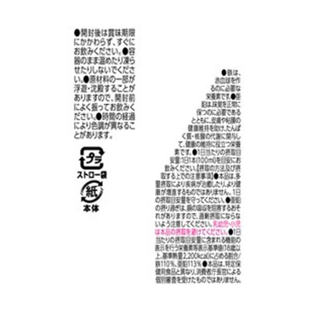 これ1本で1日分の鉄と亜鉛が摂れます。 1本(100ml)当たり、鉄7.5mg、亜鉛10.0mg。 りんご、バナナ、みかん、ピーチ、パインアップルの5種の果汁をブレンド。 やさしい甘さ。