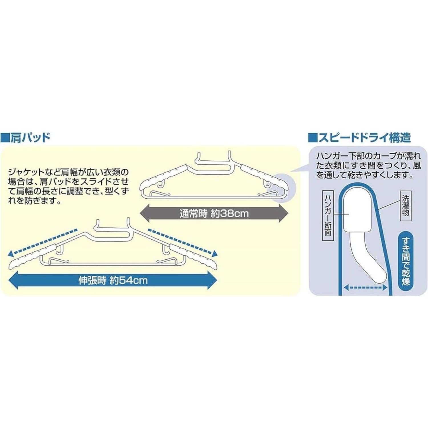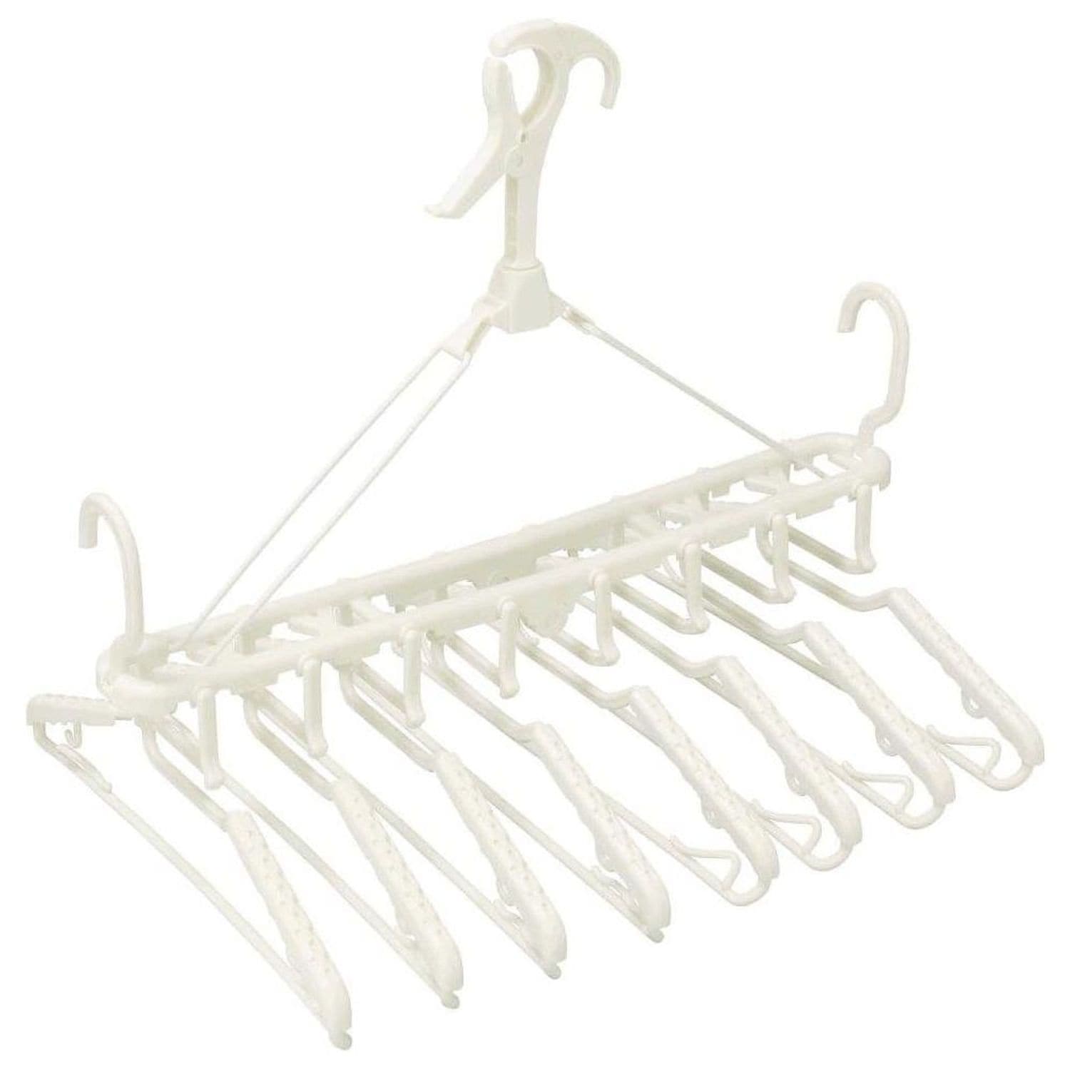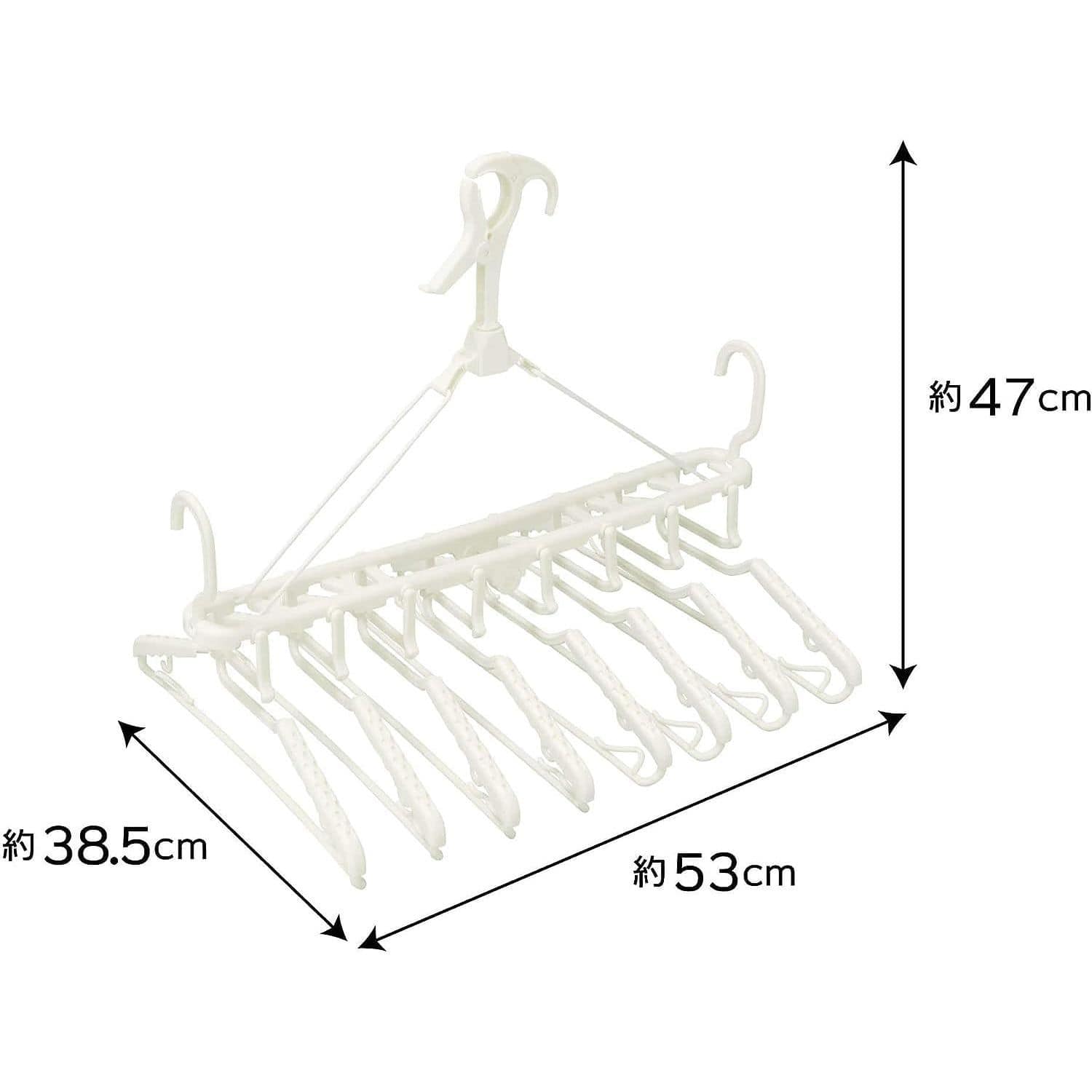「わたし」のベランダ干しスタイルシャツやタオルを一度にまとめて8枚すっきりと干せます。使用後は折りたたんで吊るしておけるのでコンパクトに収納できます。3wayキャッチフックで太いポールにもロープにも対応。鴨居フック付きで場所を選ばずに干すことができます。サイドフックは安定感抜群、傾かずに干すことができます。風で回転することもなく、洗濯物が汚れません。サイドフックを使うとより長い洗濯物を干しても地面につかなくなります。Tシャツなどの首部分を延ばさずに干せるよう片側にくぼみがついています。ハンガーの肩パッドをスライドさせることで38~54cmまで伸縮し、大きな衣類でも型崩れなく干せます。また、シャツの中に空間ができるため、空気が通りにくい脇の下も乾きやすいです。スピードドライ構造で、濡れた衣類に隙間を作り、風を通して乾きやすくします。