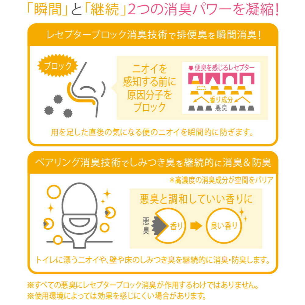 ●「レセプターブロック」で排便臭を瞬間消臭!用を足した直後の気になるニオイを瞬間的に防ぎます。 ●「ペアリング消臭技術」でしみつき臭を継続的に消臭&防臭。高濃度の消臭成分がすみずみまで広がることで空間だけでなく壁や床のニオイまで防ぎます。 ●つけかえタイプなので少ないゴミの量で使用できます。