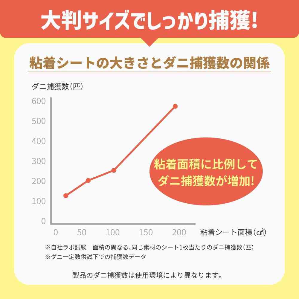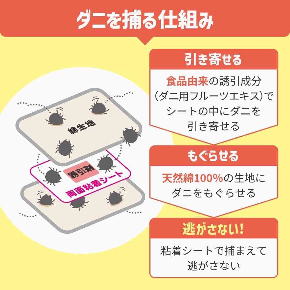 ●ダニが気になる場所に置くだけで、簡単ダニ対策! ●殺虫成分不使用。食品成分でダニを誘引します。 ●子供やペットのいるご家庭でもご使用いただけます。 ●誘引剤でダニを引き寄せ、大判サイズの強力な両面粘着シートでダニをしっかり捕獲。 ※本品はイエダニ・マダニを対象としたものではありません。 ●ダニのフンや死骸もまとめて、シートごと捨てることができます。 ●使いやすい個別包装タイプです。 ●本品は粘着シート面における屋内塵性ダニ類への捕獲効果を確認しています。