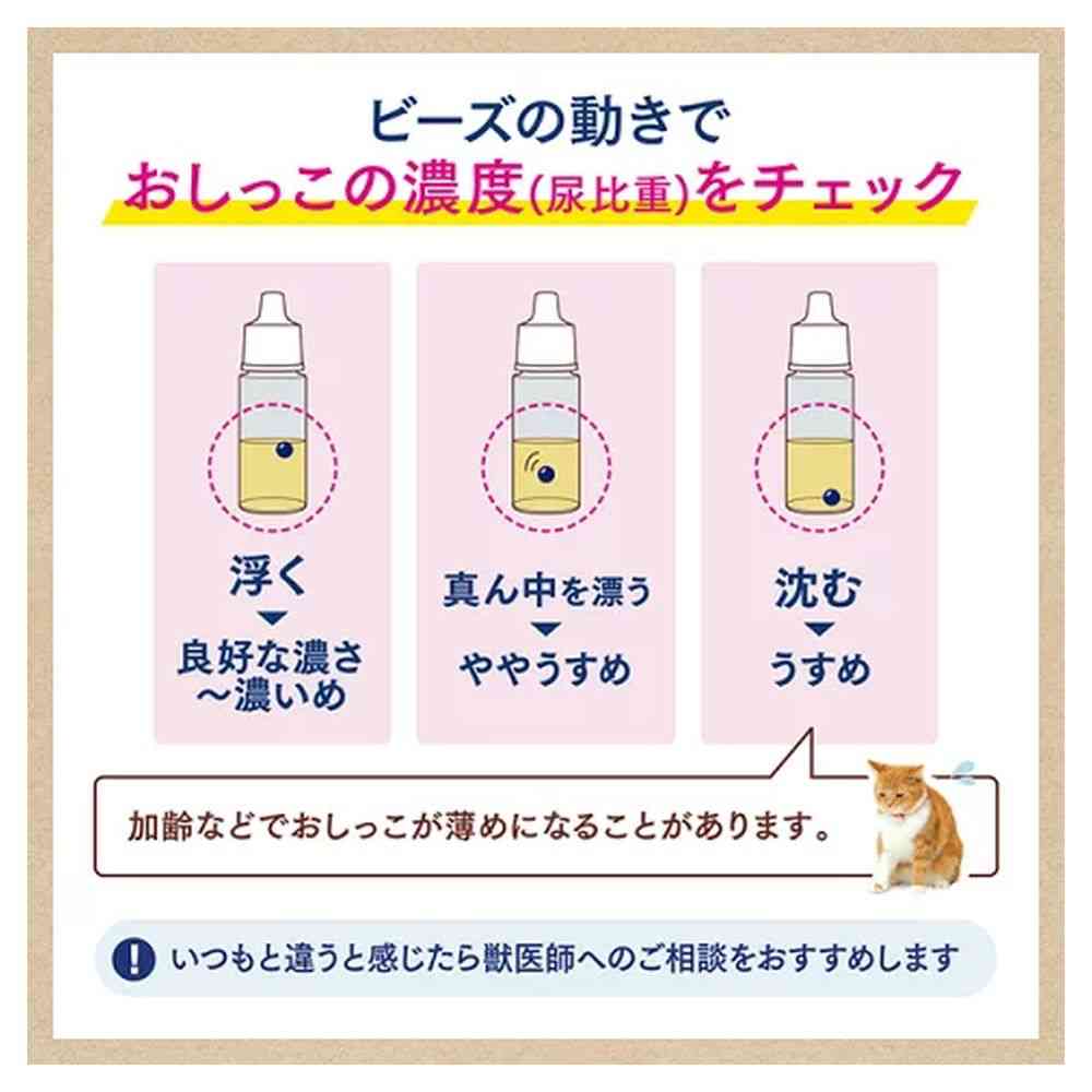 おうちで簡単におしっこチェックができます。 (1)おしっこの量・色が確認できます。 (2)ビーズの浮き沈みで、おしっこの濃度(比重)を確認できます。
