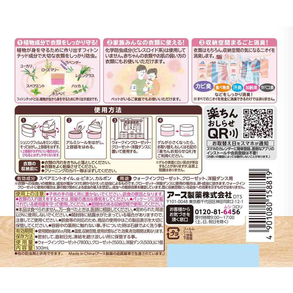 ウォークインクローゼットなどに置くだけで6ヵ月間衣類を守ります。 ピレスロイド系化学防虫成分を含まない植物由来成分を配合。