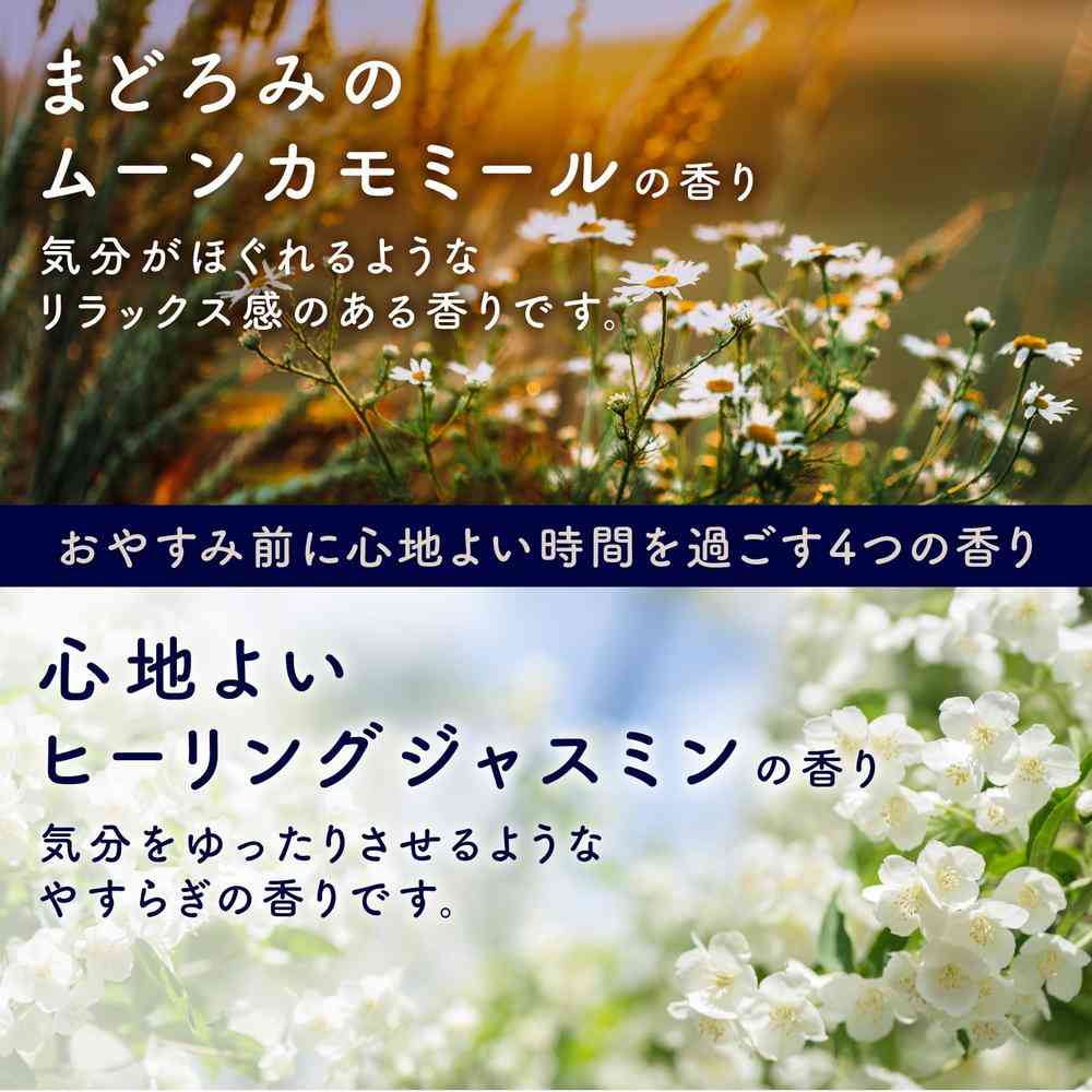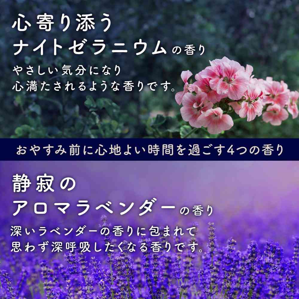 おやすみ前に心地よい時間をつくる。 富良野産ラベンダー香り成分を配合。 リラックスできる4種の香り。 色付き透明のお湯です。