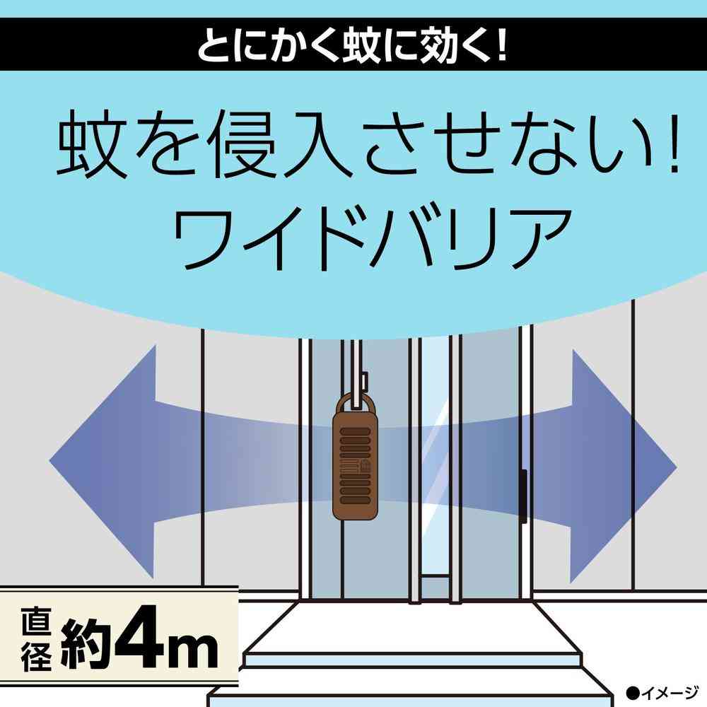 玄関などの出入口付近に設置するだけで、屋内への蚊の侵入を阻止。 屋外での忌避効果も。 直径約4mの範囲で効果があります。