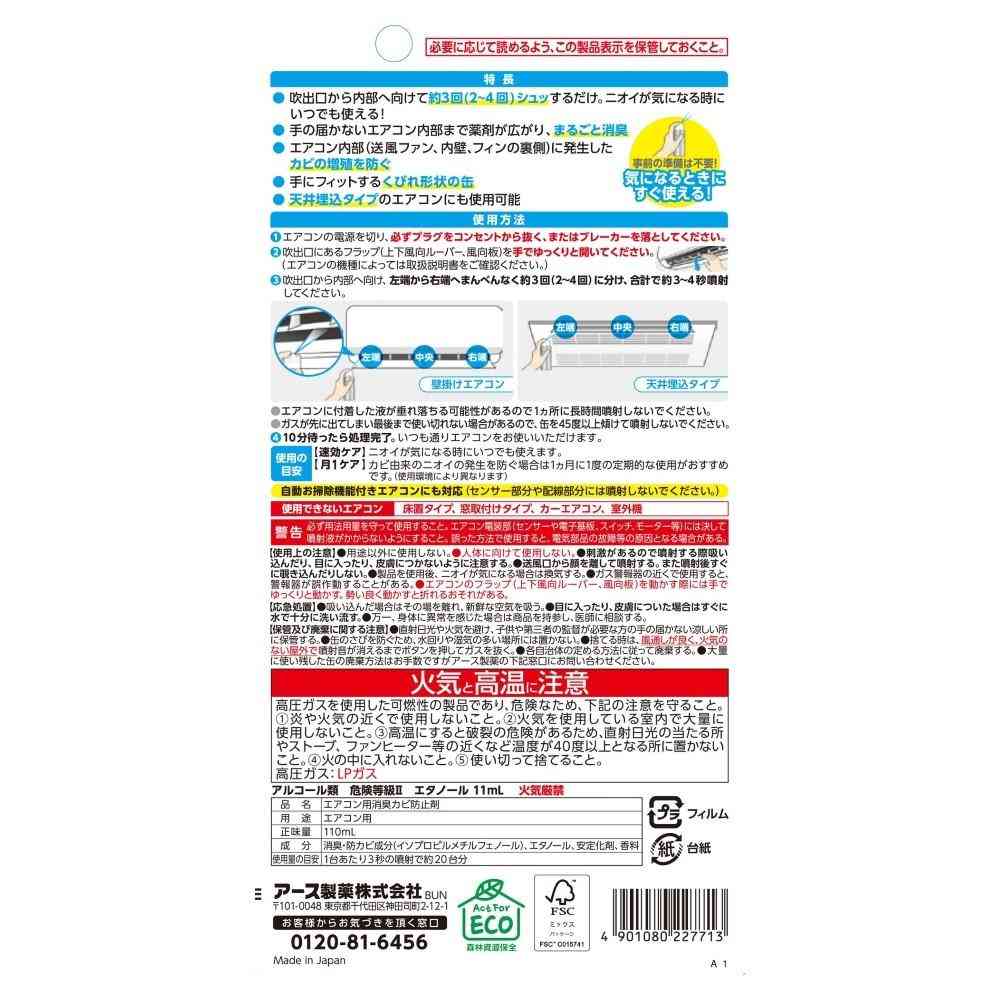 ●事前の準備は不要!気になるときにすぐ使える! ●吹出口から内部へ向けて約3回(2回から4回)シュッとするだけ。ニオイが気になる時にいつでも使える! ●手の届かないエアコン内部まで薬剤が広がり、まるごと消臭 ●エアコン内部(送風ファン、内壁、フィンの裏側)に発生したカビの増殖を防ぐ ●手にフィットするくびれ形状の缶 ●天井埋込タイプのエアコンにも使用可能 ●さわやかな森の香り ・Act For ECO・森林資源保全 ※本品はカビの増殖を防ぎ、イヤなニオイを消臭、発生を防止する商品です 【使用量の目安】1台あたり3秒の噴射で約20台分