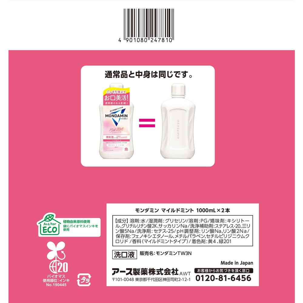 ●お口年齢をケアするモンダミン_x000D_ ●「モンダミンマイルドミント」お買得1000mL×2本_x000D_ ●ごっそり洗えてお口美活!透明感のある息続く_x000D_ ●口臭の元となるお口の汚れをしっかり除去_x000D_ ●「天然ミントオイル」「クーリング成分」(香料中)_x000D_ ●微刺激タイプ(刺激度目安:0.5/5段階中)_x000D_ ●マイルドミント味_x000D_ ●ラベルを削減した環境にやさしいシンプルボトル_x000D_ ・Act For ECO・植物由来原料使用(袋にバイオマスインキを使用)、プラ使用量削減(ボトル)_x000D_ ●ノンアルコール_x000D_ 【販売名】モンダミンTW3N_x000D_ 【化粧品・洗口液】