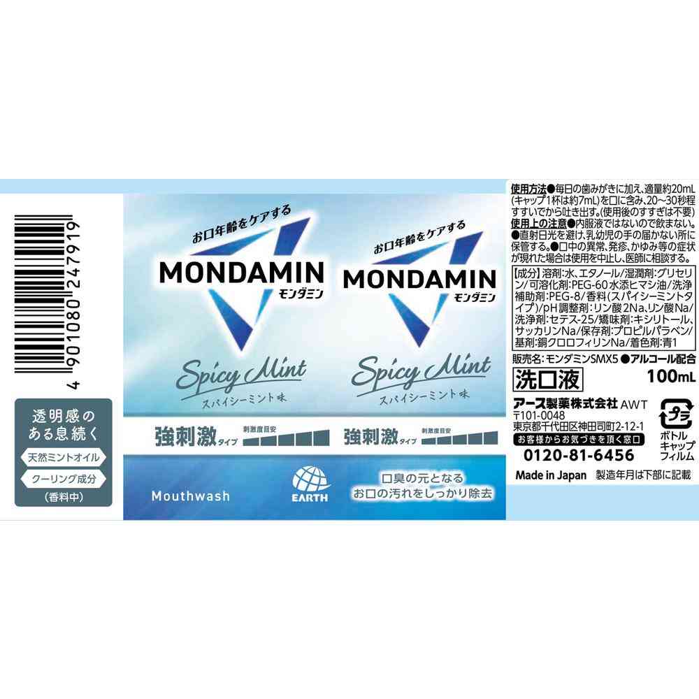 ●お口年齢をケアするモンダミン ●ごっそり洗えてお口美活!透明感のある息続く ●口臭の元となるお口の汚れをしっかり除去 ●「天然ミントオイル」「クーリング成分」(香料中) ●強刺激タイプ(刺激度目安:5/5段階中) ●スパイシーミント味 ・ActForECO・プラ使用量削減 ●アルコール配合