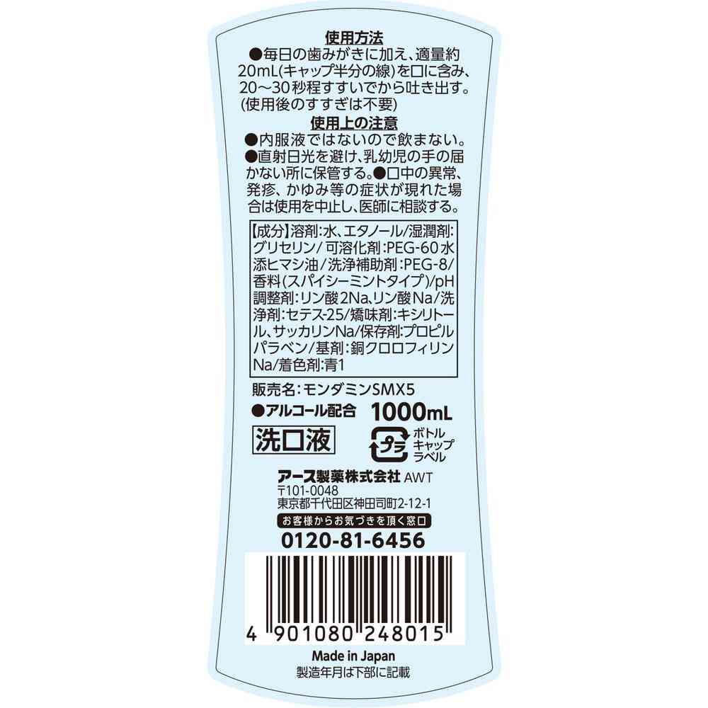 もんだみん、マウスウォッシュ、まうすうぉっしゅ、洗口液、口腔ケア、口臭ケア、オーラルケア、口臭予防、口臭対策、虫歯予防、虫歯対策、歯周病予防、歯肉炎予防、予防、対策、大容量、液体、液剤、アース