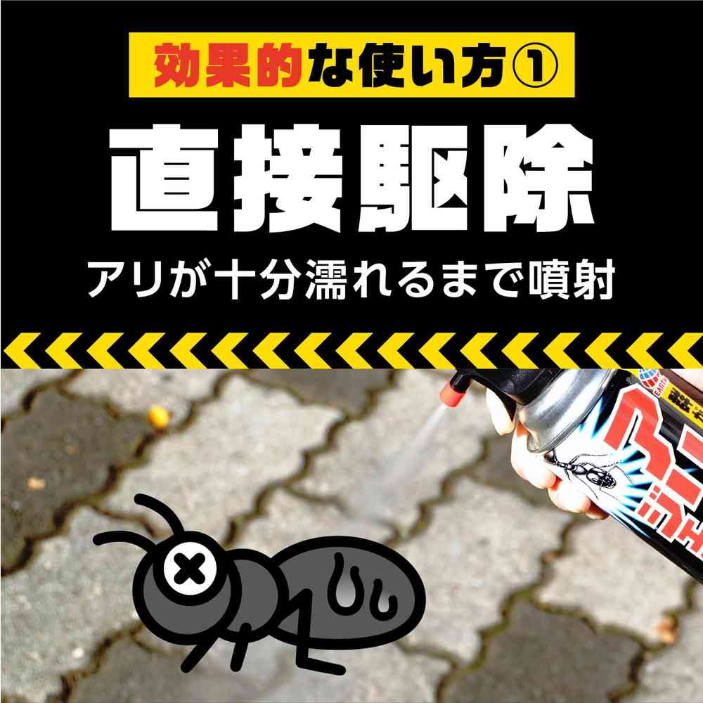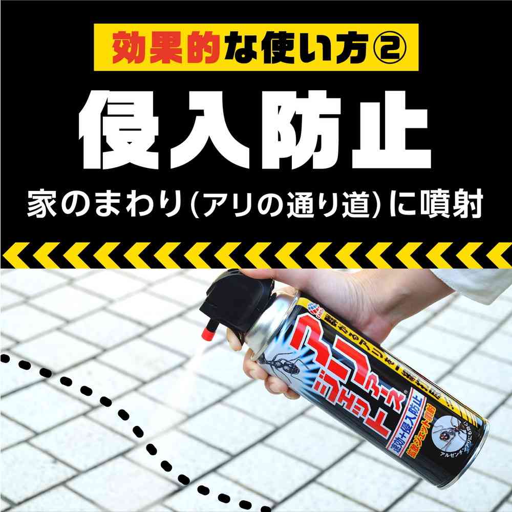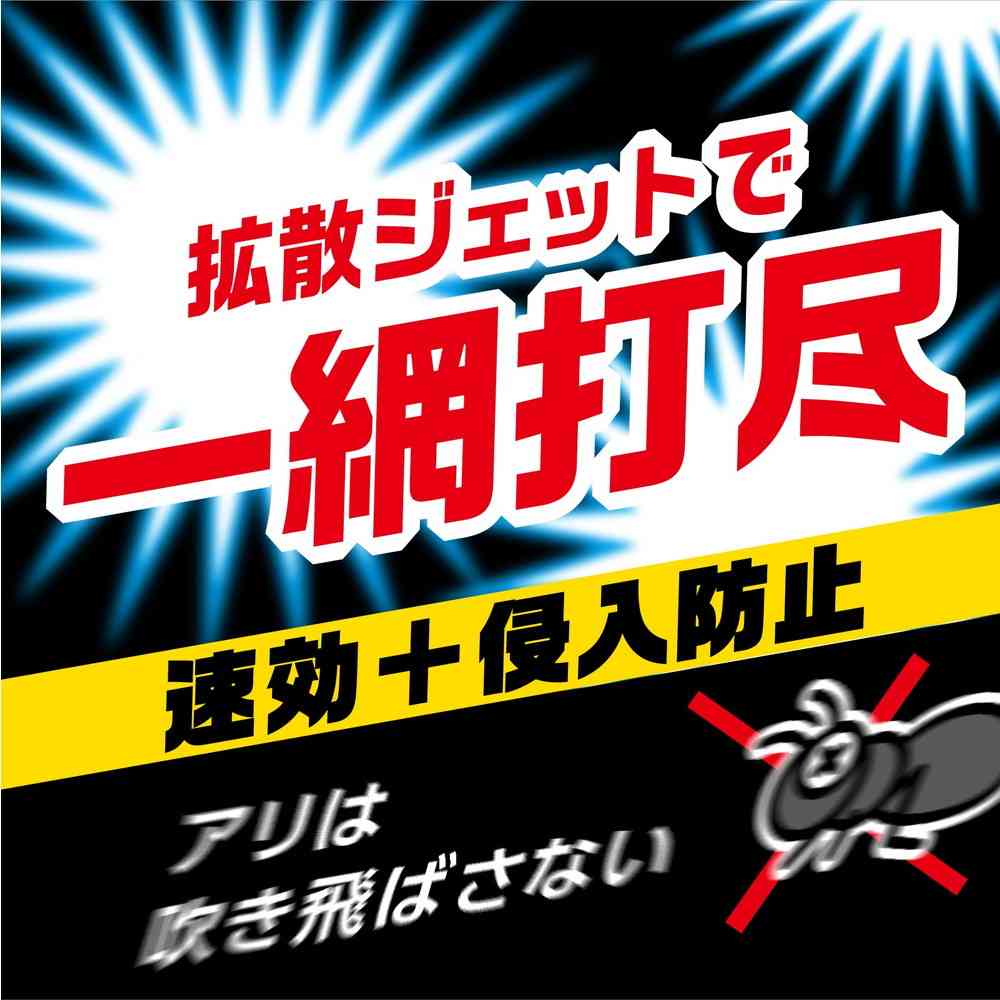 ・新開発!アリを吹き飛ばさず確実にしとめる拡散ジェット噴射!・見つけたアリの大群を拡散ジェット噴射の速効性と拡散力ですぐに駆除!・シフルトリンの持続効果で、屋内への侵入防止効果を約2週間発揮します。・集団ですばやい動きのアルゼンチンアリにも効きます。・たっぷり使える450mL入り。