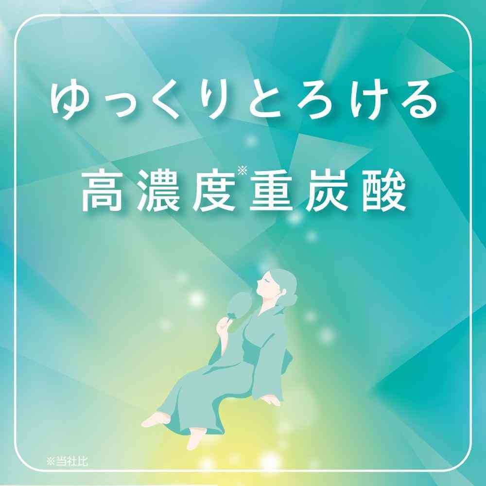 ●あしたを想うご自愛スパ ●ゆっくりとろける高濃度(※メーカー比)重炭酸 ●カラダ・キモチ・お肌よろこぶ ●夜風の凉をまとってマスカットミントの香り 【カラダ】 温泉成分(※炭酸水素ナトリウム、炭酸ナトリウム)高配合(※メーカー比)。温浴効果が高まり、カラダの芯までじんわり温まって、疲れをリセット。 イオンのベールで、湯上がり後もポカポカ感が続く。 【キモチ】 さわやかなマスカットミントの香りと、ミントグリーンの湯色。明日の新たな1日のために、心地よいひんやり感がキモチをリセットしてくれます。 【お肌】 コラーゲン、ナイアシンアミド、ヒアルロン酸、セラミド、シアバター、CICA、パルミチン酸レチノール配合(保湿成分)でうるおいたっぷり。まろやかな湯ざわりで、なめらかなお肌へ。 ●ミントグリーンの湯色(にごり) ・Act For ECO・再生プラ使用
