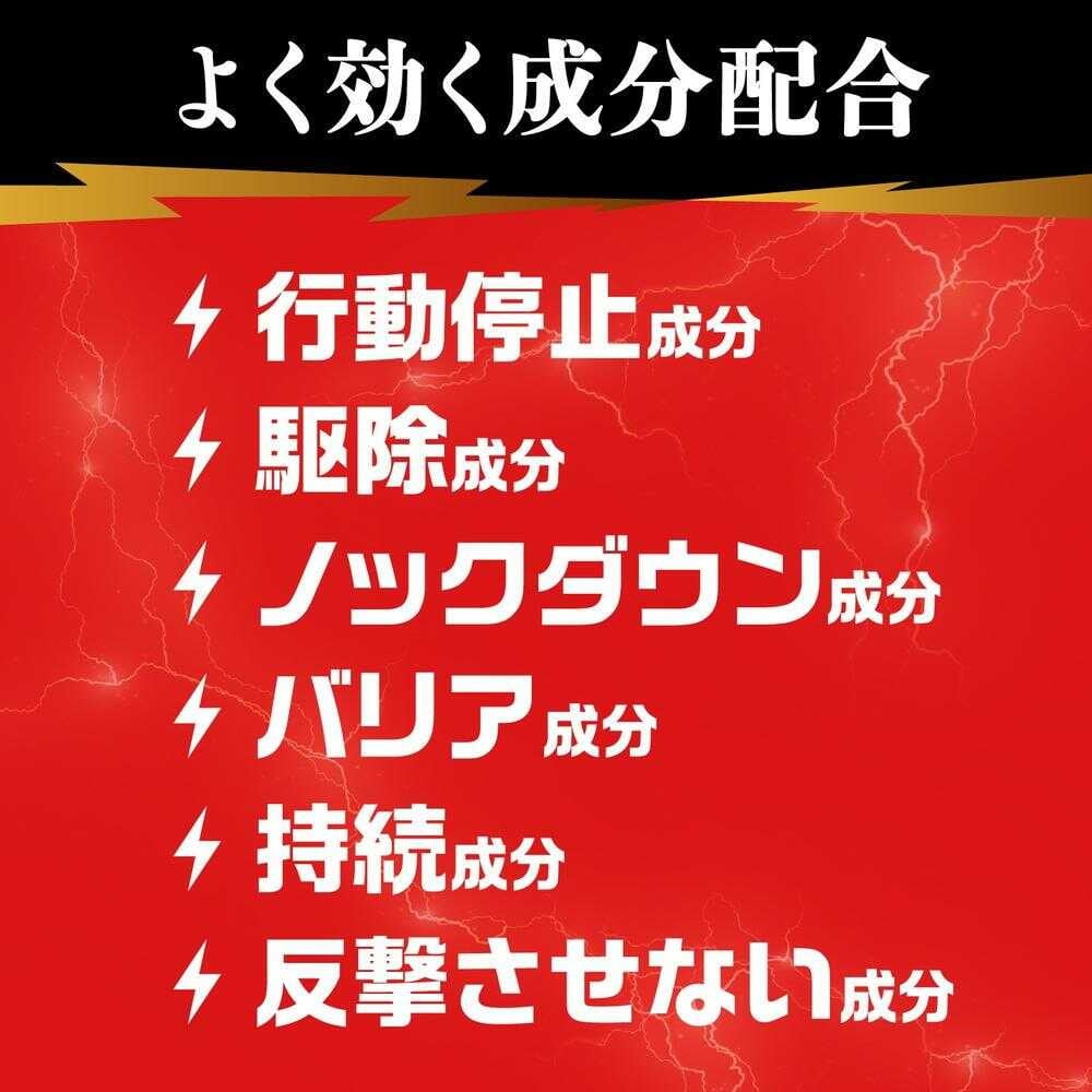 モンフルオロトリン、d-T80-フタルスリン、ビフェントリン、トランスフルトリン、チモール、無力化成分※ ※ハチやムカデを反撃させない状態にする、植物にも含まれる成分です。