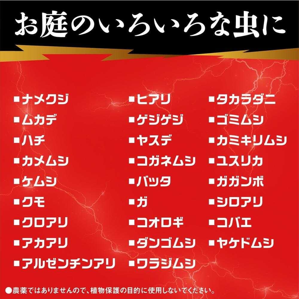 ●害虫なんでもこい! ※側面の対象害虫をご確認ください。(スズメバチの巣の駆除には専用の商品をご使用ください。) ●使用開始時にストッパーを上に持ちあげ折りとる 【駆除】害虫に向けて直接スプレーする。 【発生防止】害虫を発生させたくない場所にスプレーする。(1平方メートルあたり約5秒噴射)※駆除効果による ※屋外専用 【対象害虫】 ナメクジ、ムカデ、ハチ、カメムシ、ケムシ、クモ、クロアリ、アカアリ、アルゼンチンアリ、ヒアリ、ゲジゲジ、ヤスデ、コガネムシ、バッタ、ガ、コオロギ、ダンゴムシ、ワラジムシ、タカラダニ、ゴミムシ、カミキリムシ、ユスリカ、ガガンボ、シロアリ、コバエ、ヤケドムシ