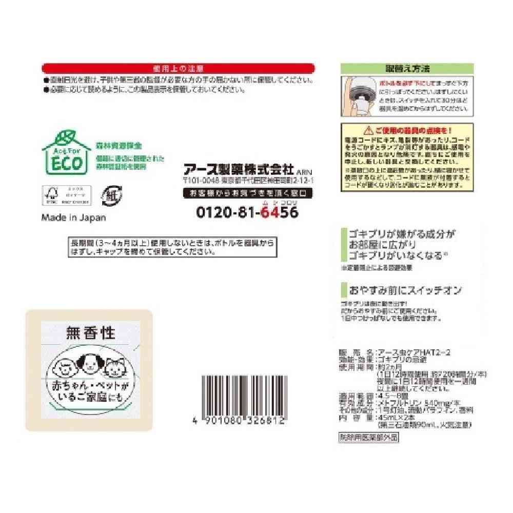●おうちまるごと予防空間 ●ゴキブリ用 ●2ヵ月(1日12時間使用) ●スイッチONするだけで、超マイクロ粒子がお部屋のすみずみまで広がります。 ●ゴキブリが嫌がる成分がお部屋に広がりゴキブリがいなくなる※定着阻止による忌避効果 ●おやすみ前にスイッチオン ・ゴキブリは夜に動き出す!だからおやすみ前にご使用ください。1日中つけっぱなしでも使用できます。 ●赤ちゃん・ペットがいるご家庭にも ●無香性 【使用期間】約2ヵ月(1日12時間使用・約720時間分/本)夜間に1日12時間使用を1週間以上継続してください。 【適用範囲】4.5畳から8畳