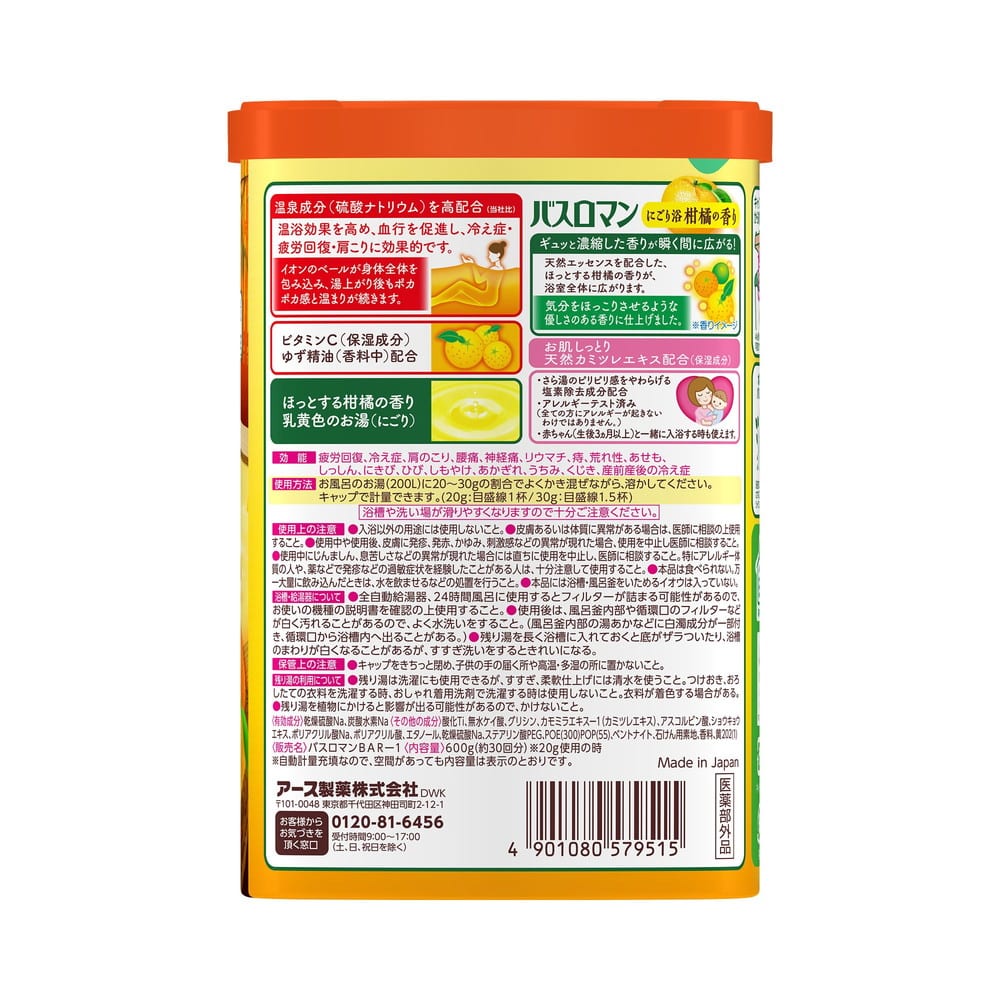 ●温泉成分(硫酸ナトリウム)を高配合:温浴効果を高め、血行を促進し、冷え症・疲労回復・肩こりに効果的です。イオンのベールが身体全体を包み込み、湯上がり後もポカポカ感と温まりが続きます。_x000D_ ●ビタミンC(保湿成分)、ゆず精油(香料)配合_x000D_ ●ギュッと濃縮した香りが瞬く間に広がる!:天然エッセンスを配合した、ほっとする柑橘の香りが、浴室全体に広がります。気分をほっこりさせるような優しさのある香りに仕上げました。_x000D_ ●お肌にやさしい天然カミツレエキス配合(保湿成分)_x000D_ ●さら湯のピリピリ感をやわらげる塩素除去成分配合_x000D_ ●アレルギーテスト済み(全ての方にアレルギーが起きないわけではありません。)_x000D_ ●赤ちゃん(生後3ヵ月以上)と一緒に入浴する時も使えます。_x000D_ ●水に強いバリア容器:浴室に30日間保管されることを想定したシャワリングテスト実施_x000D_ ●環境にやさしい容器:再生パルプ約77%使用(容器本体の紙部分)_x000D_ ●たっぷり約30回分※20g使用の時 【香り】ほっとする柑橘の香り_x000D_ 【お湯色】乳黄色のお湯(にごり)