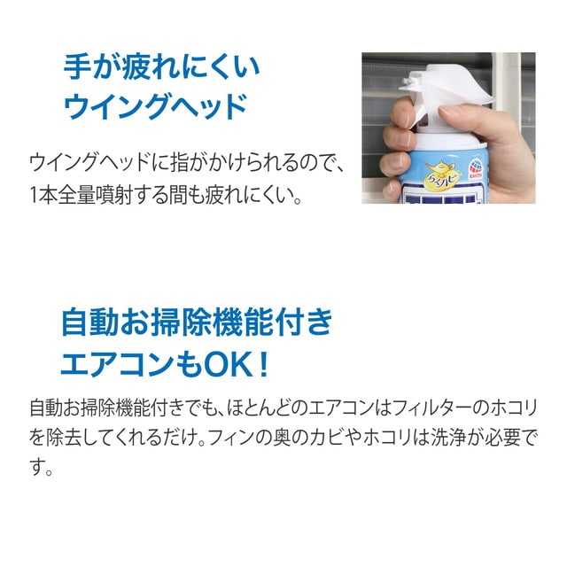 ●スプレーするだけでエアコンを簡単洗浄。エアコンが2台あるご家庭や買い置きに便利でお得な2本パック。_x000D_ ●緑茶ポリフェノールと除菌剤を配合。すっきり消臭・しっかり除菌。_x000D_ ●エアコンのフィンに発生したカビの増殖を抑える。(全ての菌やカビを除去するわけではありません)_x000D_ ●フィンの奥まで洗浄できる縦長ワイド噴射。_x000D_ ●清潔なエアコンでより快適な空気環境に。_x000D_ ●手が疲れにくいウイングヘッド。_x000D_ ●自動お掃除機能付きエアコンにも使える。(※センサー部分や配線部分には処理しないでください)_x000D_ ●無香性_x000D_ 【品名】エアコンフィン用合成洗剤_x000D_ 【用途】エアコンフィン用_x000D_ 【液性】中性