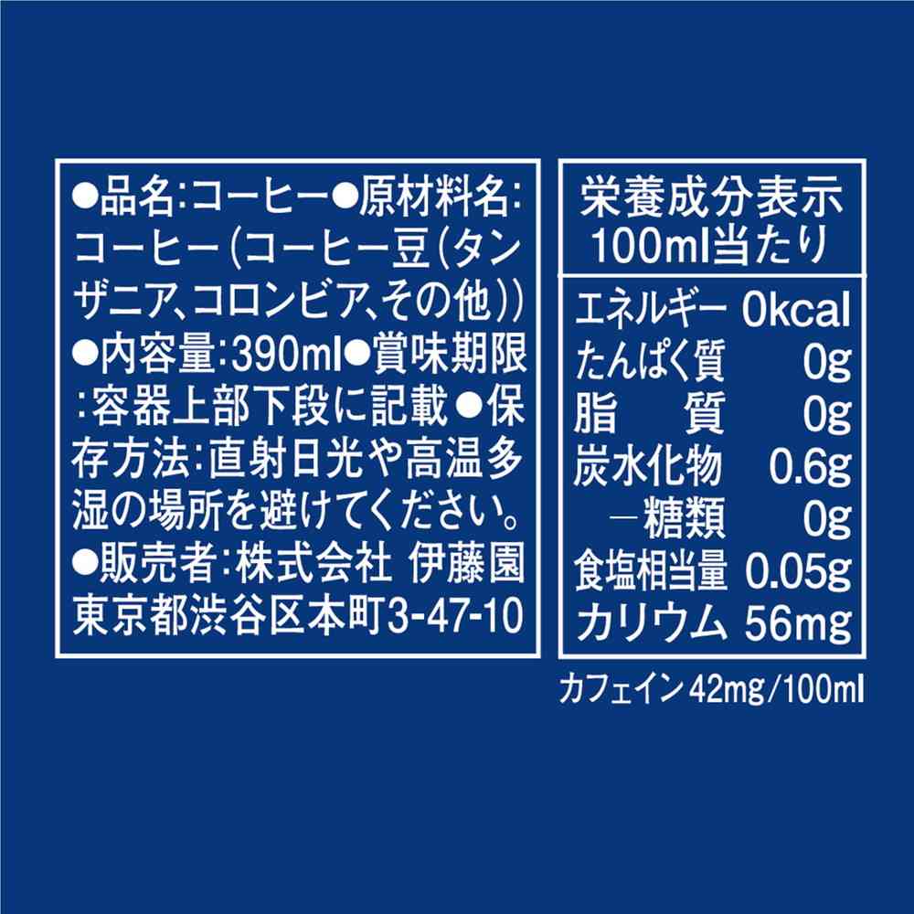 コーヒー(コーヒー豆(タンザニア、コロンビア、その他)) 栄養成分表示100mlあたり エネルギー0kcal、たんぱく質0g、脂質0g、炭水化物0.6g(糖類0g)、食塩相当量0.05g、カリウム56mg、カフェイン42mg