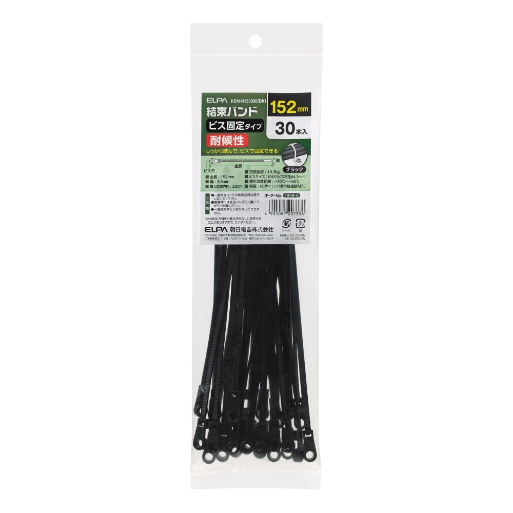 ●ビス固定タイプ ●耐候性 ●しっかり結んで、ビスで固定できる■全長:152mm ■幅:3.6mm ■最大結束内径:32mm ■引張強度:18.2kg ■ビスサイズ:M4.0(ビス穴径φ4.3mm) ■使用温度範囲:-40度~+85度 ■材質:66ナイロン(紫外線遮蔽剤入) ■30本入 ■カラー:ブラック