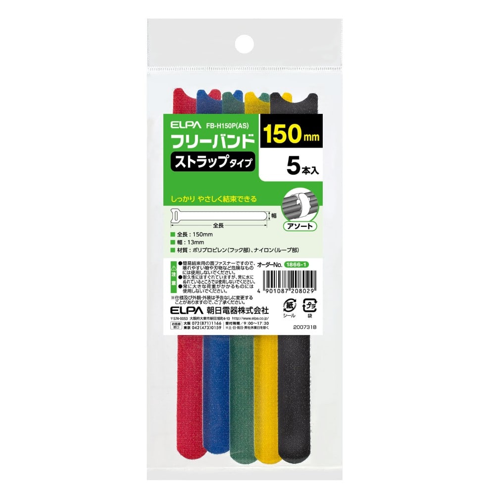 ●ストラップタイプ ●しっかり やさしく結束できる■全長:150mm ■幅:13mm ■材質:ポロプロピレン(フック部)、ナイロン(ループ部) ■5本入 ■カラー:アソート
