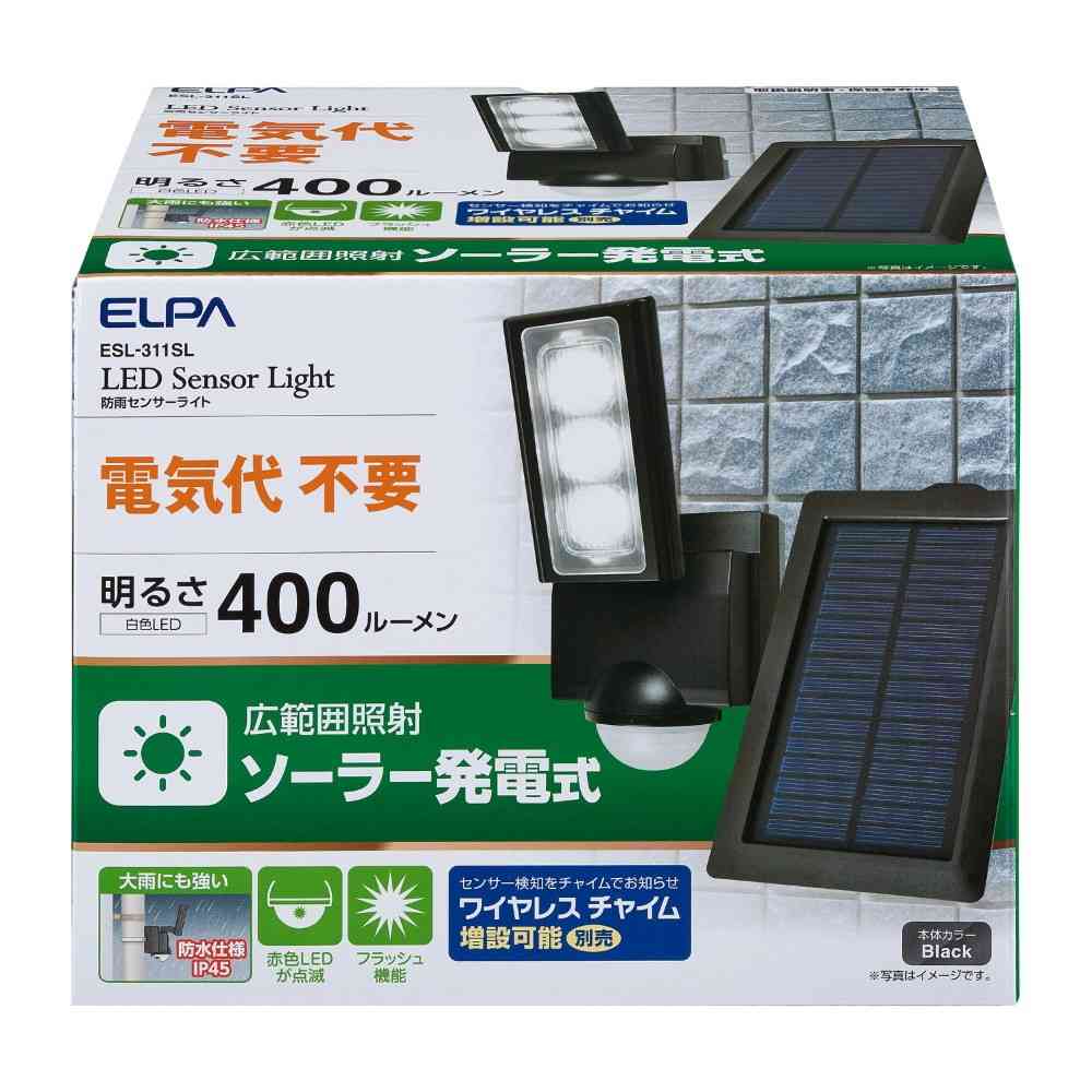●センサーが人や車の動きを検知して自動点灯 ●屋外に設置できる防水仕様(IP45 防噴流形) ●ソーラー発電式なのでコンセントがない場所に設置でき、電気代もかかりません ●センサーが検知し点灯を開始する周囲の明るさを調整可能 ●5秒点灯・10秒点灯・10秒点滅の点灯モードからお好みで選択可能 ●LEDなので省エネなのに明るい ●低赤外線・低UVで発熱が少なく虫も集まりにくい光 ●フラッシュ機能 ●赤色LEDが点滅 ●ワイヤレスチャイム増設可能(別売) 【センサーライト本体】 ■検知方式:赤外線受動式 ■電源:ニッケル水素充電池 4.8V 1800mAh ■光源:白色 LED ※LEDの交換はできません ■全光束:400lm ■点灯・点滅保持時間:5秒点灯、10秒点灯、10秒点滅 ■点灯開始照度:約4lx(夜)~(昼) ■保護等級:IP45(防噴流形) ■質量:約220g(充電池除く) 【ソーラーパネル】 ■種類:シリコン多結晶 ■出力:8V 150mA ■接続コード長:約5m ■保護等級:IP45(防噴流形) ■質量:約270g