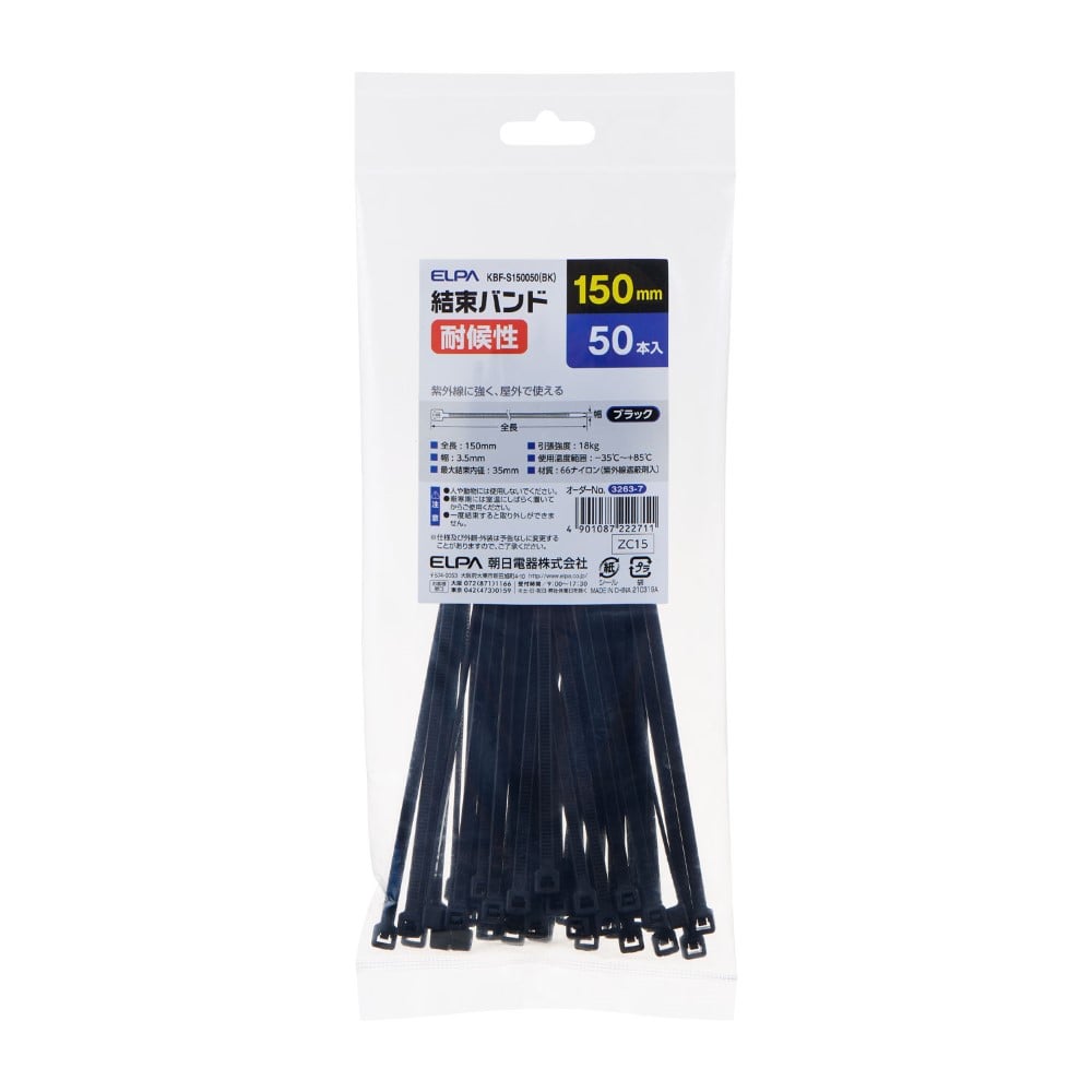●耐候性 ●紫外線に強く、屋外で使える■全長:150mm ■幅:3.6mm ■最大結束内径:35mm ■引張強度:18kg ■使用温度範囲:-40度~+85度 ■材質:66ナイロン(紫外線遮蔽剤入) ■50本入