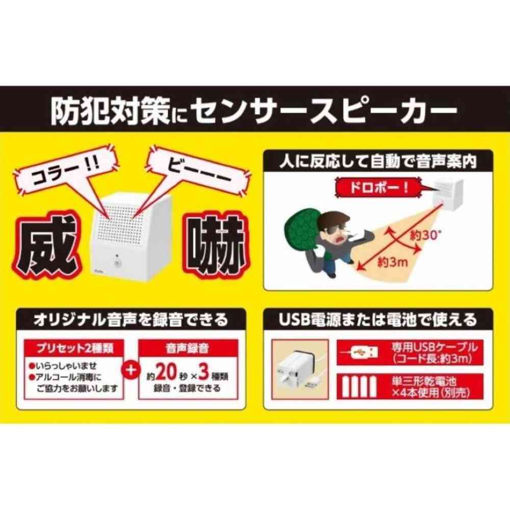 ●人に反応して自動で音声案内 ●選べる音声5種類(プリセット音声「いらっしゃいませ」「アルコール消毒にご協力をお願いします」の2種類、約20秒のオリジナル音声録音3種類) ●お店の販促や来客の対応に ●ボタンを押すだけで音声の切り替えが可能 ●電池またはUSB電源で使える2way電源 ■電源:単三アルカリ乾電池x4本(別売)またはDC5V(USB) ■電池寿命:約12ヶ月(1日に100回使用時) ※電池の性能、使用条件により電池寿命は短くなる場合があります ■音量:(大)約80dB/50cm、(小)約70dB/50cm ■センサー検知距離:約3m ※使用条件によって異なります ■センサー検知角度:水平約30°※使用条件によって異なります ※高さ1.2m設置時 ■外形寸法(約):幅90x高さ102x奥行97(mm)(最大値) ■質量:約220g(電池除く) ■付属品:専用USBケーブル1個(コード長 約3m) ■屋内用