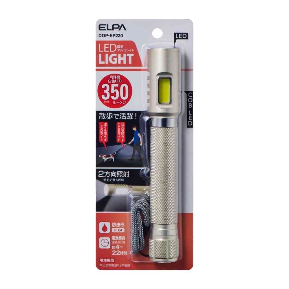 ●明るさ350lm ●防沫形IPX4 ●遠くと足元の2方向照射が可能なので散歩で活躍します ●光が均一で見やすい非球面レンズ ●ハンズフリーで手元を照らす ■使用電池:単三形アルカリ乾電池×2本(別売) ■連続点灯時間:全灯 約4時間 / LED(HI) 約4時間 / LED(LOW) 約22時間 / COB LED 約8時間 ※アルカリ乾電池使用時 ※電池の性能、使用条件により連続点灯時間は短くなる場合があります ■光源:白色LED×1灯+白色COB LED×1灯 ■明るさ:全灯 約350lm/ LED(HI) 約350lm/ LED(LOW) 約80lm/ COB LED 約100lm ※アルカリ乾電池初期時 ■外形寸法(約):直径26×全長166(mm)(ハンドストラップ・クリップ除く、最大値) ■質量:約98g(電池除く、ハンドストラップ・クリップ含む) ■防水仕様:IPX4(防沫形) ■付属品:ハンドストラップ