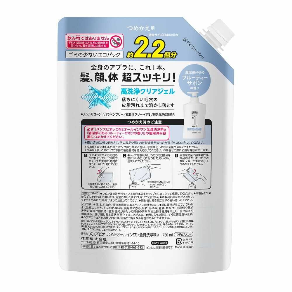 ●傷、はれもの、湿疹等異常のあるところには使わない。 ●肌に異常が生じていないかよく注意して使う。肌に合わない時、使用中に赤み、はれ、かゆみ、刺激、色抜け(白斑等)や黒ずみ等の異常が出た時、直射日光があたって同様の異常が出た時は使用を中止し、皮フ科医へ相談する。使い続けると症状が悪化することがある。 ●目に入った時は、すぐに充分洗い流す。 ●ヘアマニキュアをお使いの方は、色落ちが早くなる場合があるので注意する。 <つめかえ時のご注意> 必ず「メンズビオレONEオールインワン全身洗浄料a(清潔感のあるフルーティーサボンの香り)」の使用済み容器につめかえてください。 ●使い切ってからつめかえて、他の製品や異なった製造番号のものが混ざらないようにしてください。 ・つめかえ前にボトルの中とポンプ部分をよく洗い、水気を切ってから全量つめかえてください。 ・つめかえ後、このパックの下部の製造番号を控えておいてください。お問合せの際に必要な場合があります。