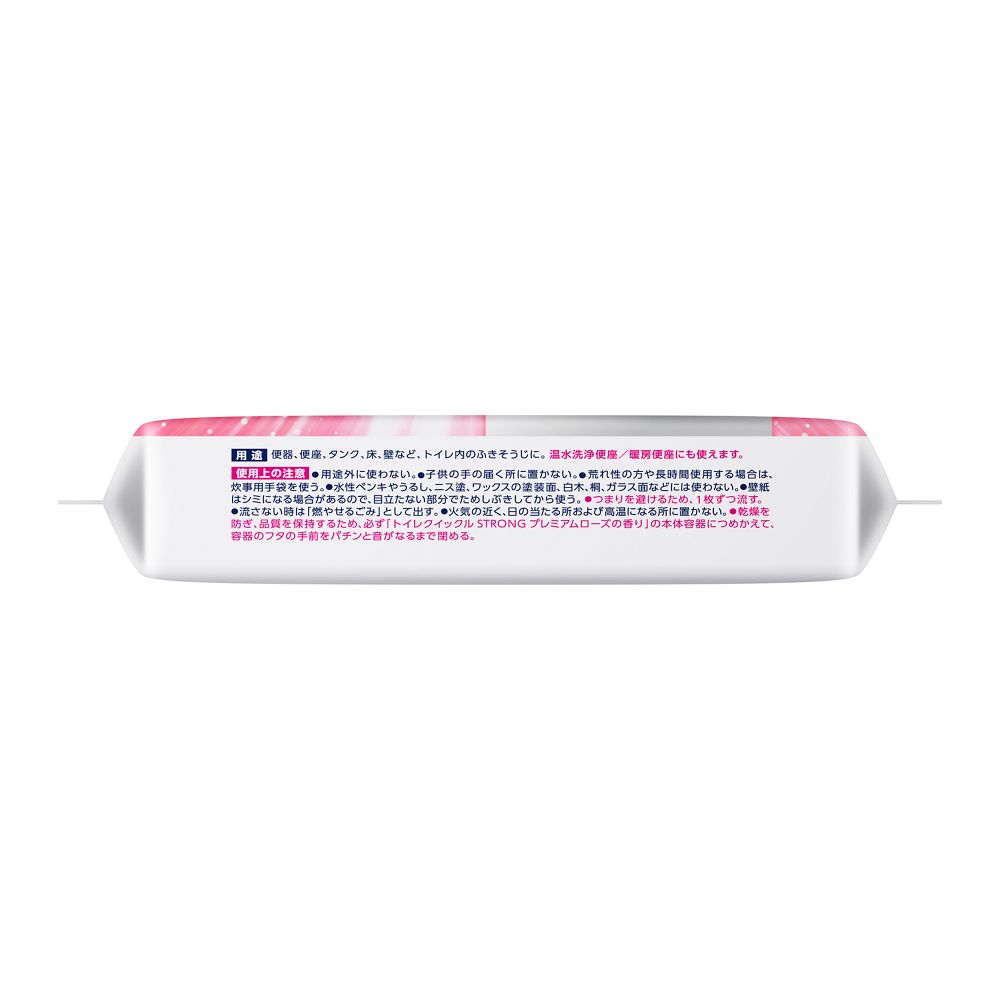 ●用途外に使わない。 ●子供の手の届く所に置かない。 ●荒れ性の方や長時間使用する場合は、炊事用手袋を使う。 ●水性ペンキやうるし、ニス塗、白木、桐、ガラス面などには使わない。 ●壁紙はシミになる場合があるので、目立たない部分でためしぶきしてから使う。 ●つまりを避けるため、1枚ずつ流す。 ●流さない時は「燃やせるごみ」として出す。 ●火気の近く、日の当たる所および高温になる所に置かない。 ●乾燥を防ぎ、品質を保持するため、必ず「トイレクイックルSTRONGプレミアムローズの香り」の本体容器につめかえて、容器のフタの手前をパチンと音がなるまで閉める。