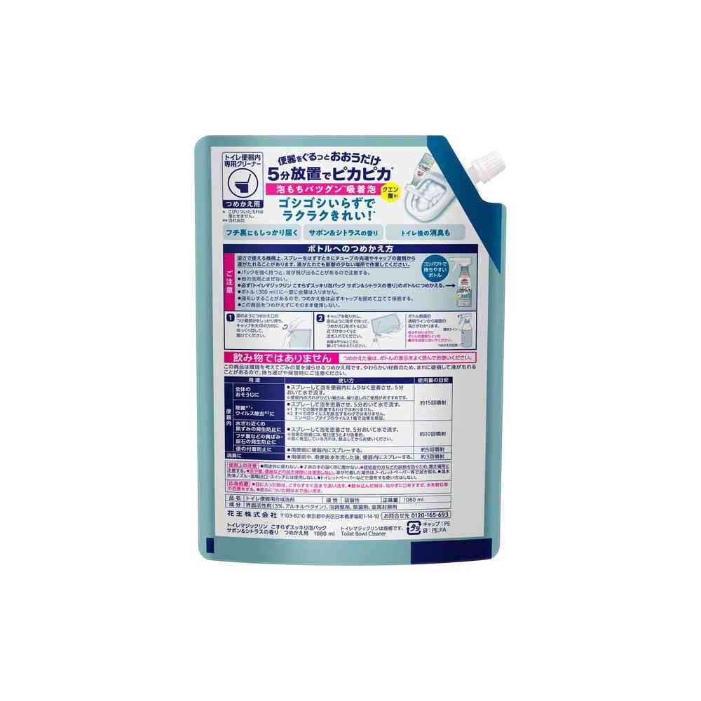 花王株式会社、kao、マジックリン、トイマジ、こすらずスッキリ、泡パック、トイレ、トイレ掃除、トイレの洗剤、洗剤、こすらない、つけ置き、つけ置き洗浄、泡、泡スプレー、パック、汚れ、黒ずみ、消臭、防臭、除菌、洗浄、臭わない、サボン、シトラス、詰替、詰替え、つめかえ、レフィル、入替、いれかえ、ストック、大容量