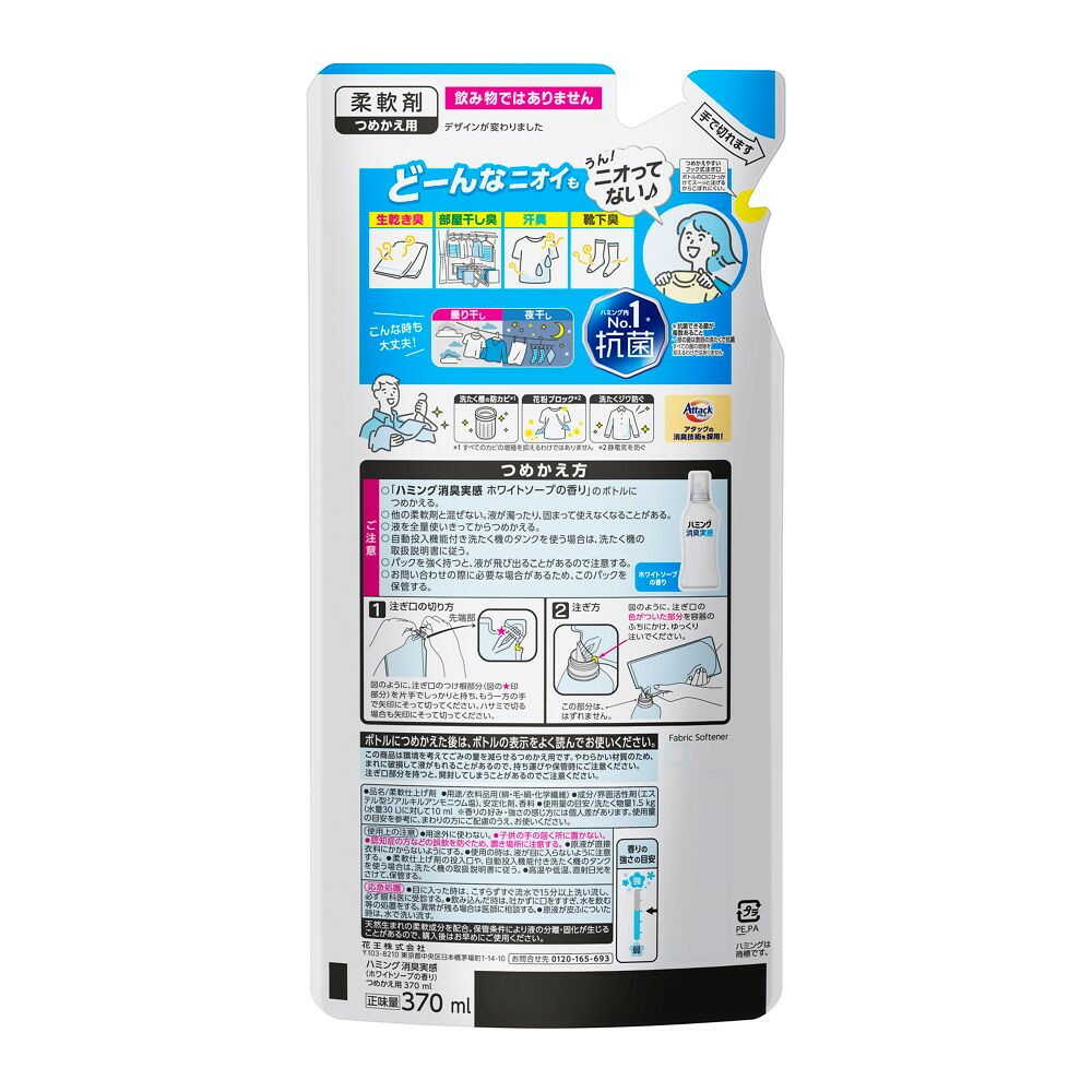 つめかえ方 ご注意 ○「ハミング消臭実感 ホワイトソープの香り」のボトルにつめかえる。 ○他の柔軟剤と混ぜない。液が濁ったり、固まって使えなくなることがある。 ○液を全量使いきってからつめかえる。 ○自動投入機能付き洗たく機のタンクを使う場合は、洗たく機の取扱説明書に従う。 ○パックを強く持つと、液が飛び出ることがあるので注意する。 ○お問い合わせの際に必要な場合があるため、このパックを保管する。 使用上の注意 ●用途外に使わない。 ●子供の手の届く所に置かない。 ●認知症の方などの誤飲を防ぐため、置き場所に注意する。 ●原液が直接衣料にかからないようにする。 ●使用の時は、液が目に入らないように注意する。 ●柔軟仕上げ剤の投入口や、自動投入機能付き洗たく機のタンクを使う場合は、洗たく機の取扱説明書に従う。 ●高温や低温、直射日光をさけて、保管する。"